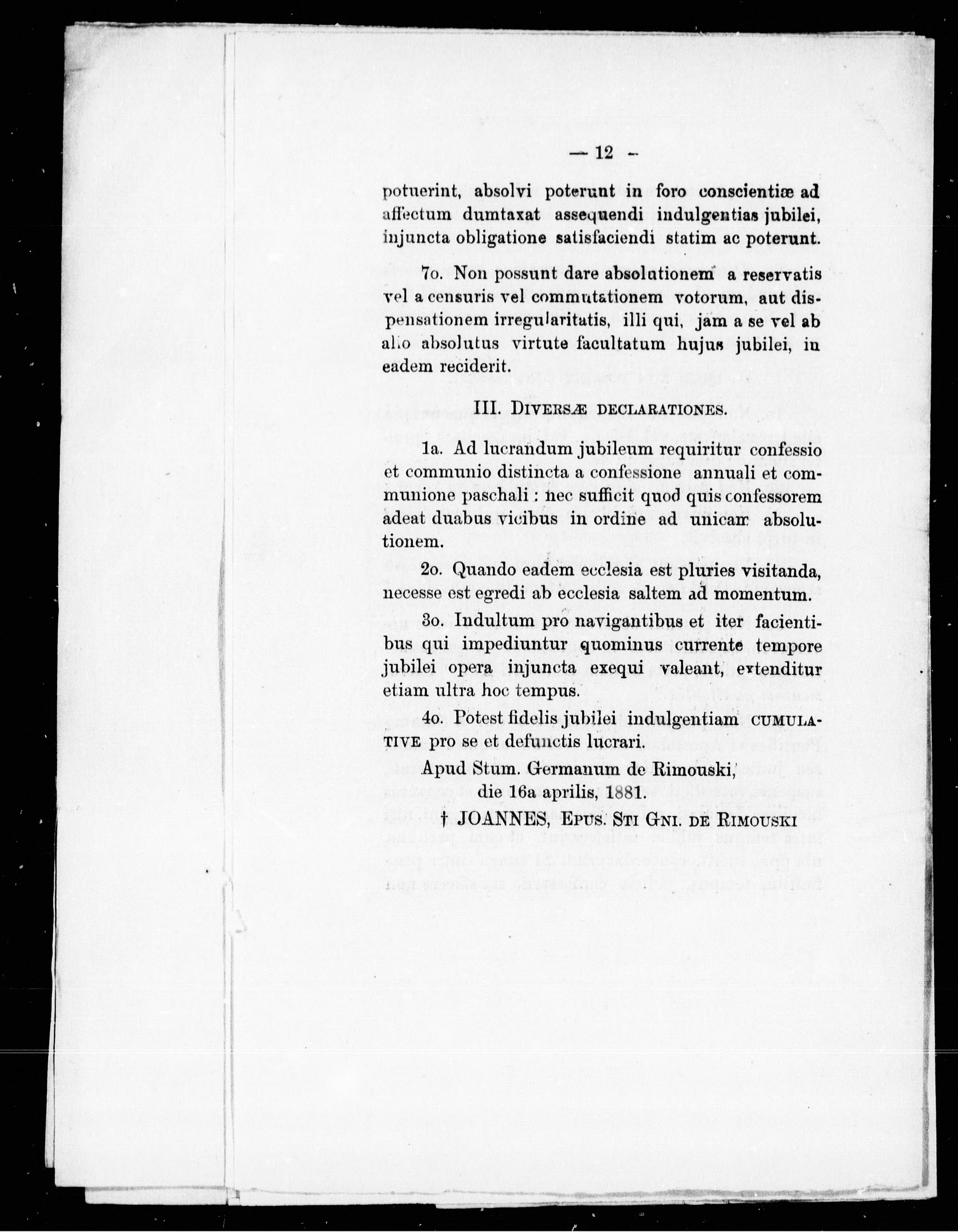 - Mandement annonçant un jubilé extraordinaire : Jean Langevin, par la grâce de Dieu et du St. Siége [sic] apostolique, évêque de St. Germain de Rimouski, au clergé séculier et régulier ...