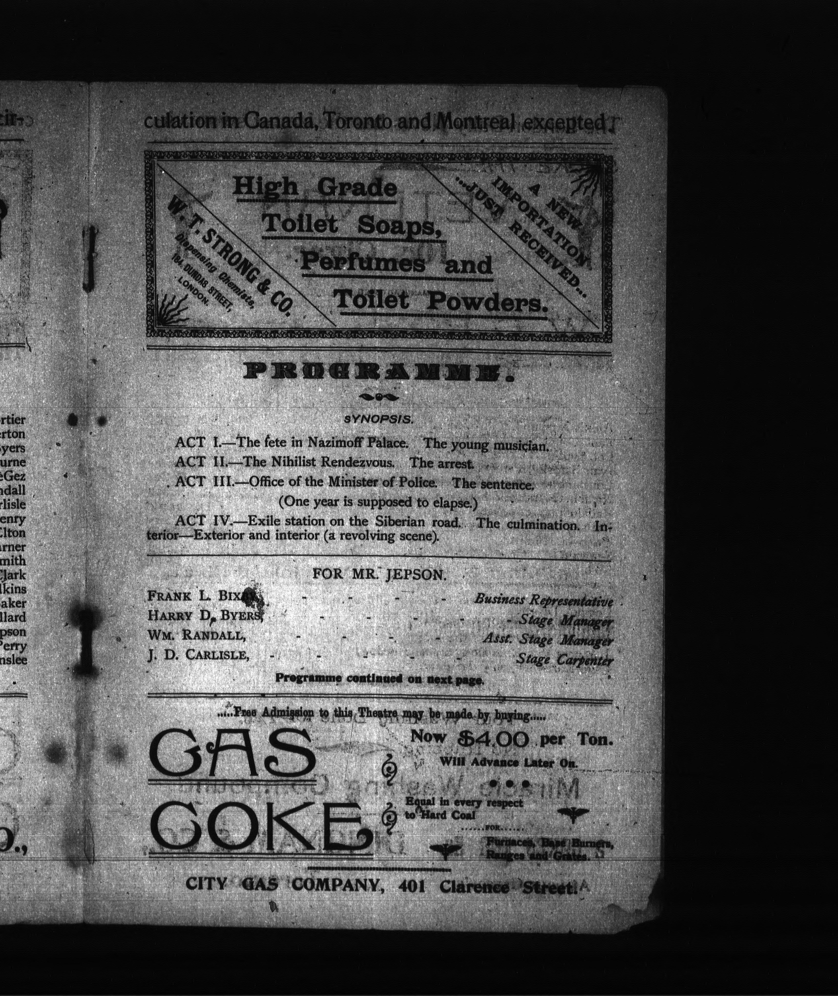 - Grand Opera House, London, Ont., programme : three nights and Saturday matinee, September 7, 8, 9, Edwin C. Jepson's production of Darkest Russia, the great play of the Czar's realm, by H. Gratton Donnelly.