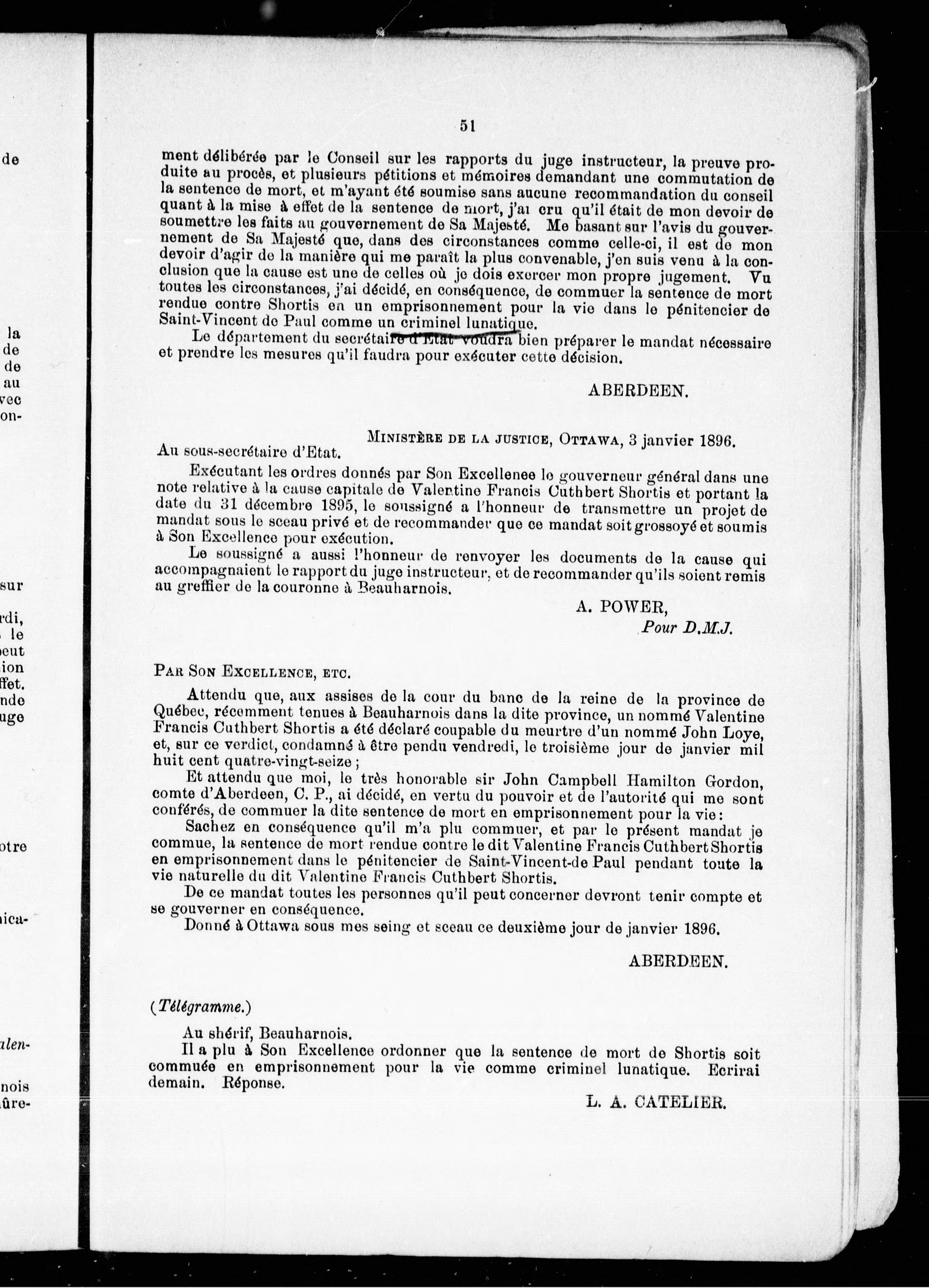 Documents relatifs à la commutation de la sentence de mort dans la cause de Valentine F.C. Shortis.