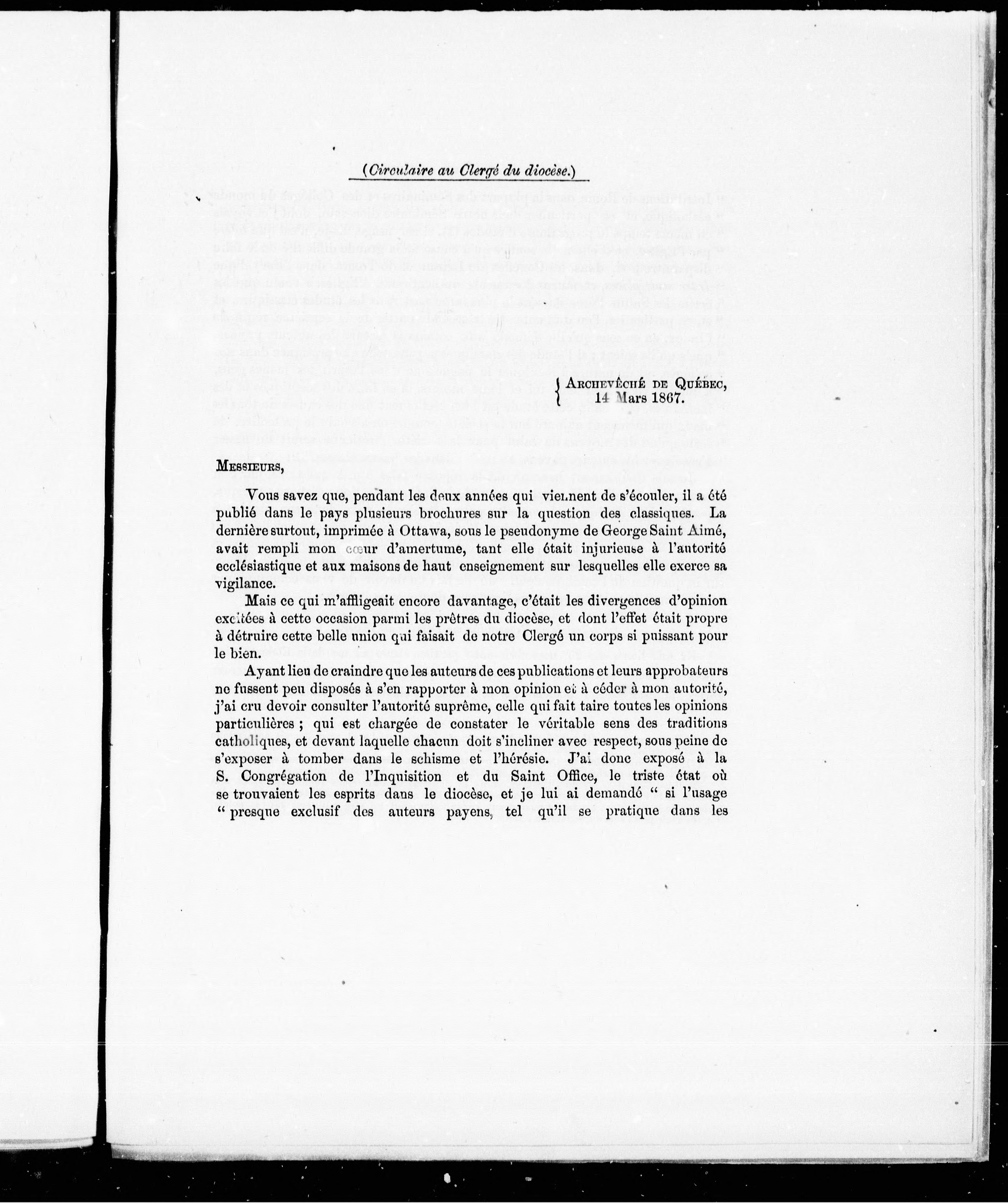 Daté: Archevêché de Québec, 14 mars 1867.