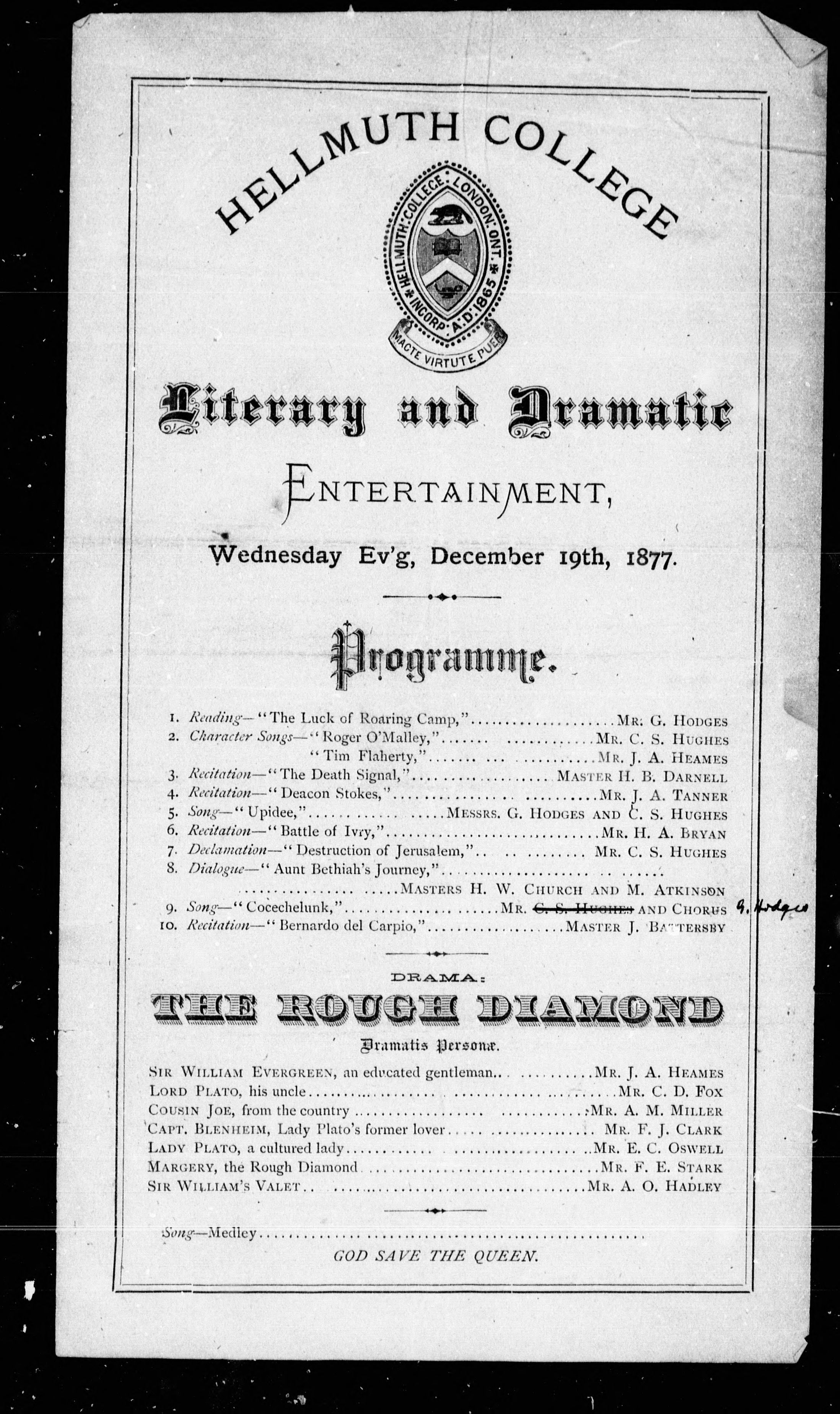 Hellmuth College : literary and dramatic entertainment, Wednesday ev'g, December 19th, 1877 ..