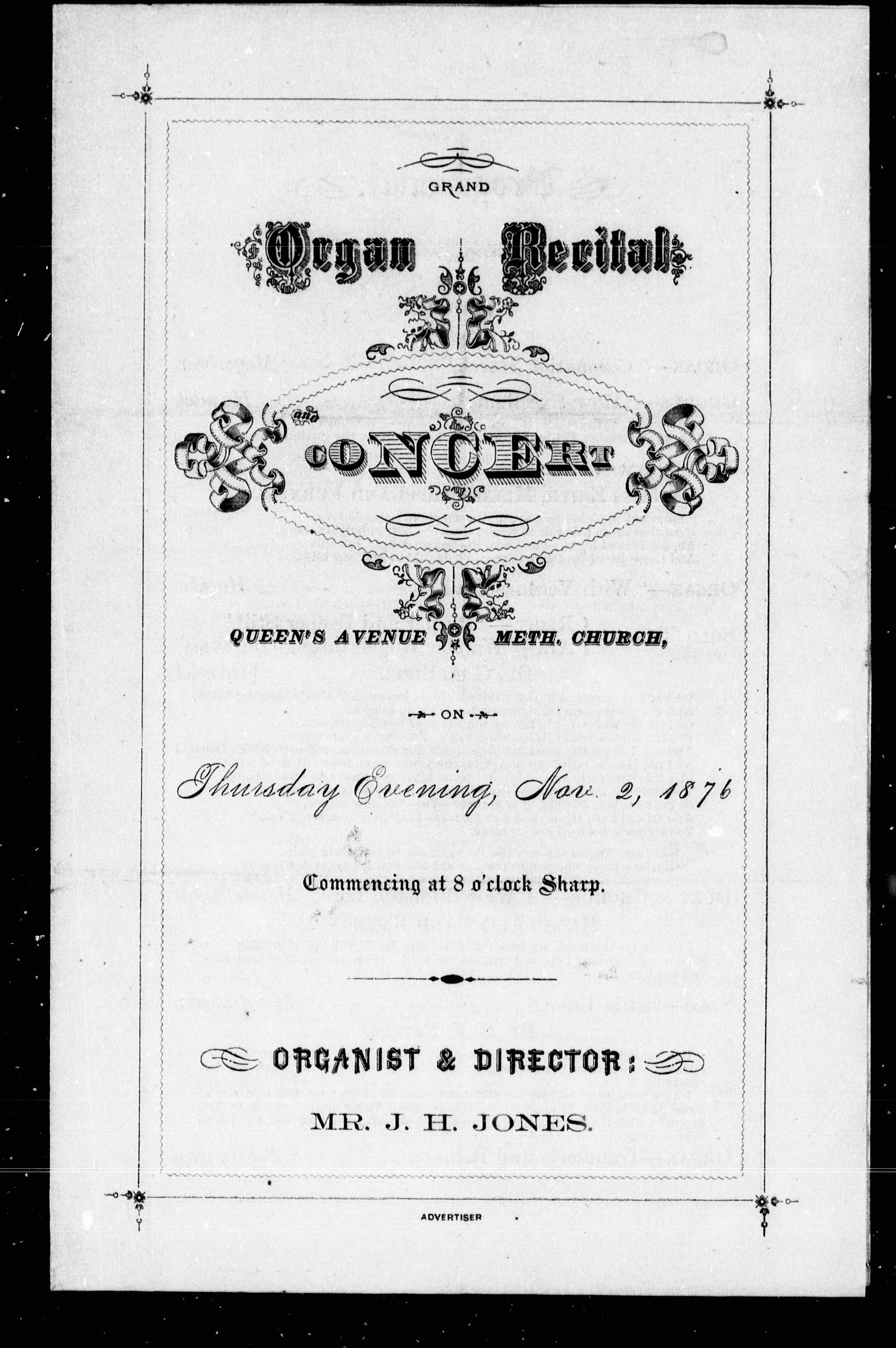 - Grand organ recital concert, Queen's Avenue Meth. Church on Thursday evening, Nov. 2, 1876, commencing at 8 o'clock sharp : organist & director, Mr. J.H. Jones.