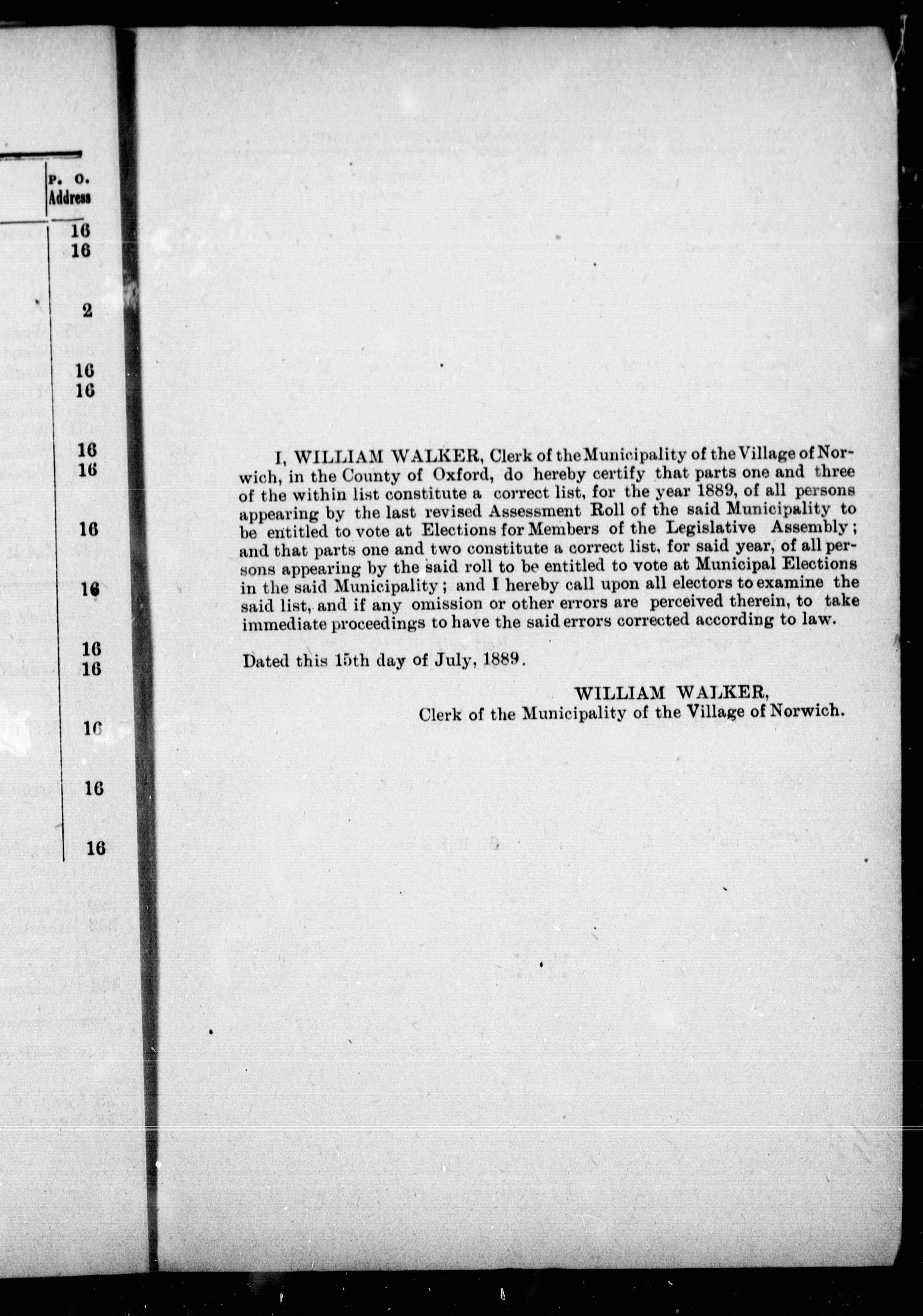 Signed: William Walker, clerk of the municipality of the village of Norwich.