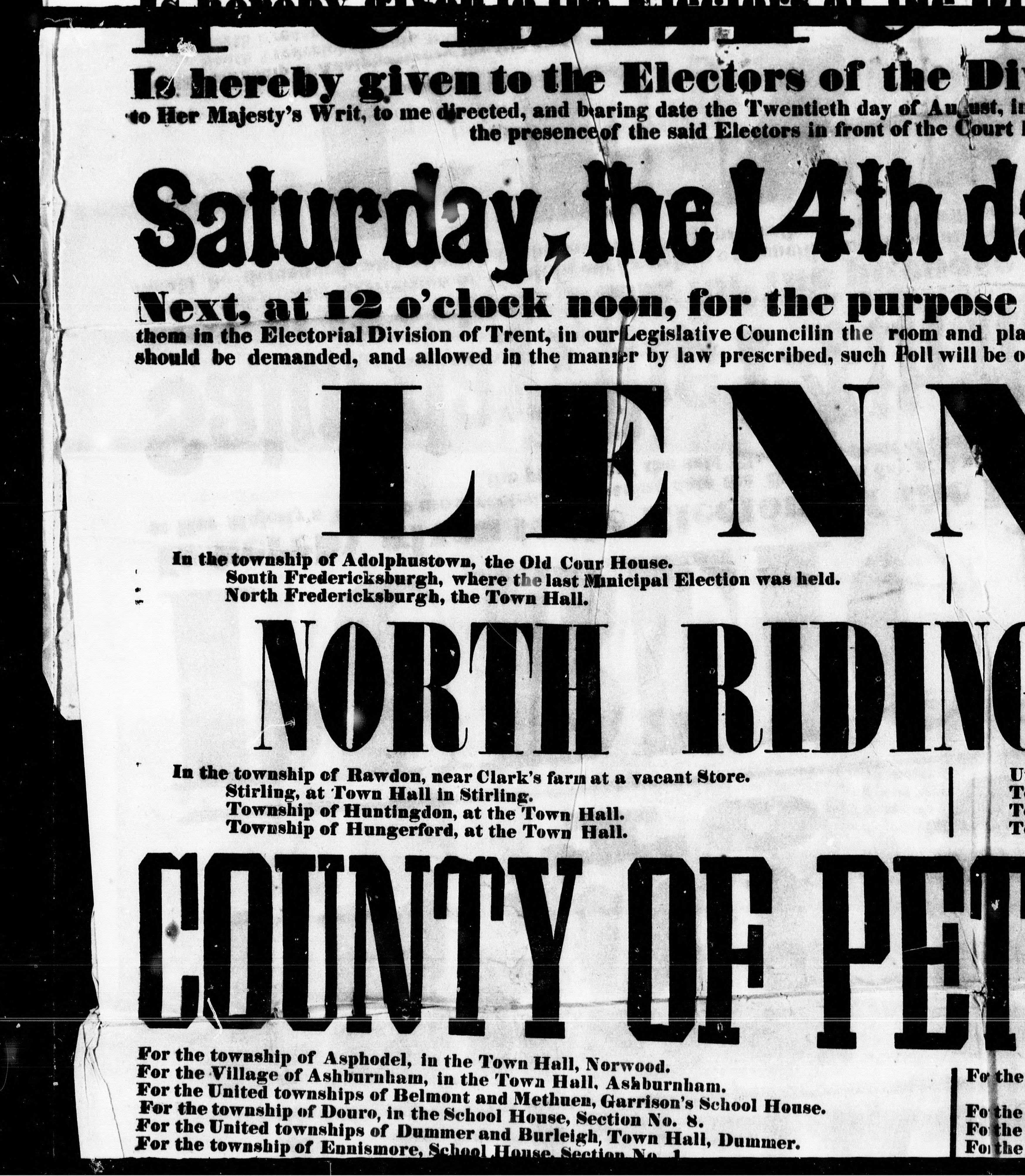 - Proclamation!! : Trent Division, to wit : public notice is hereby given to the electors of the division of Trent ... for the purpose of electing a person to represent them in the electoral division of Trent ..