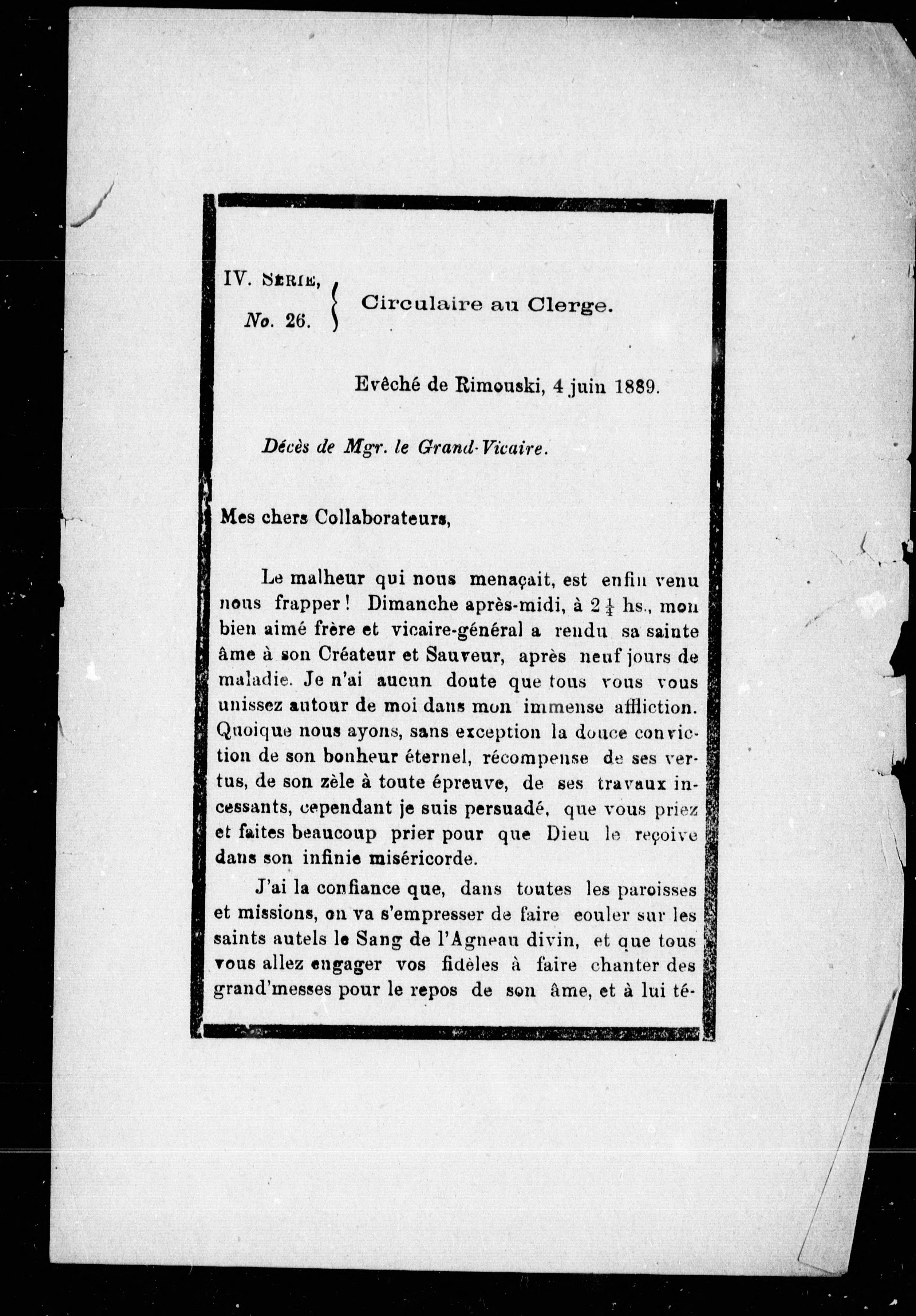 Daté: Évêché de Rimouski, 4 juin 1889.