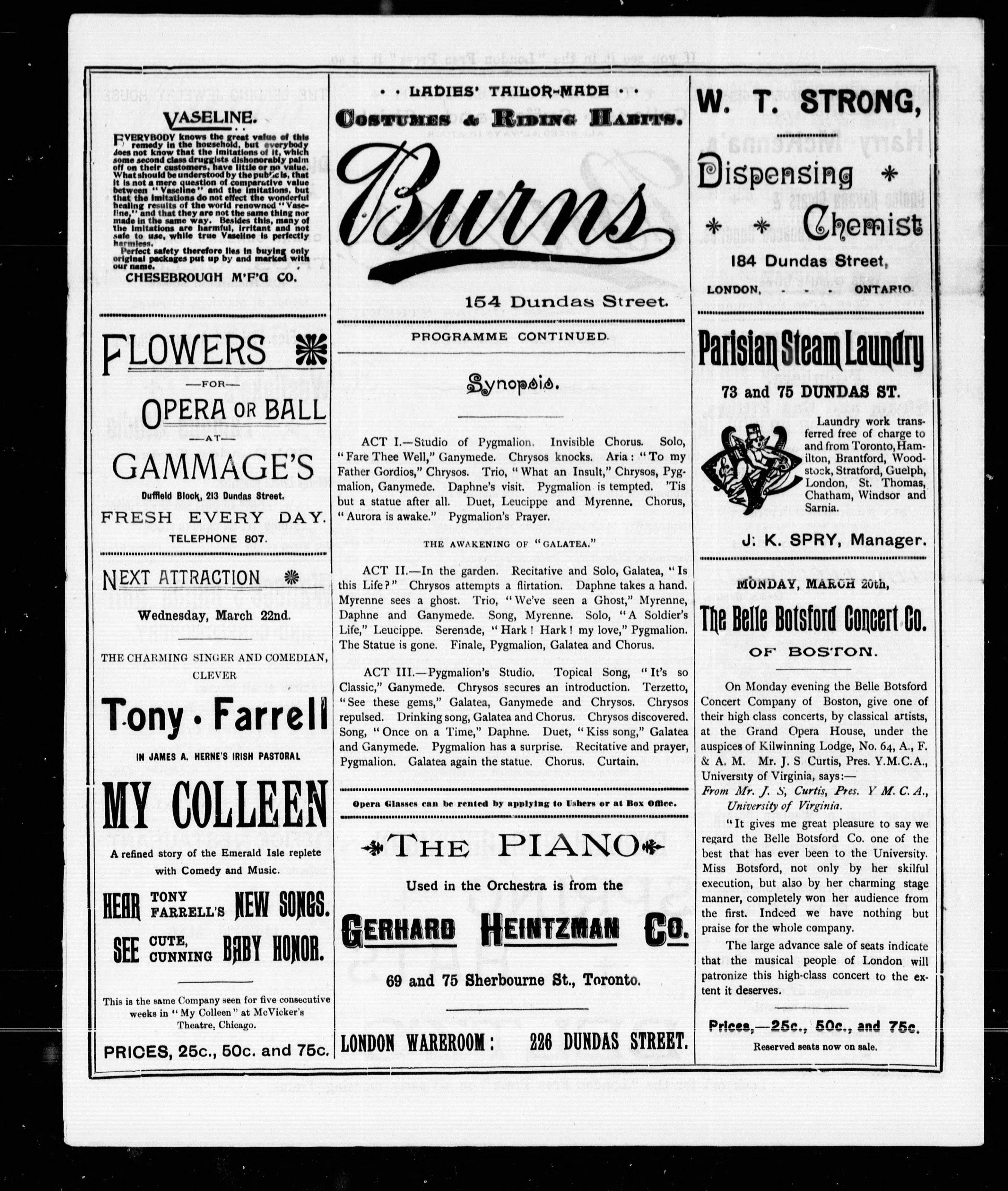- Grand Opera House, London, Ont. : Saturday, March 18th, 1893 : programme, Boston Ideal Comic Opera Comp'y, Galatea ..