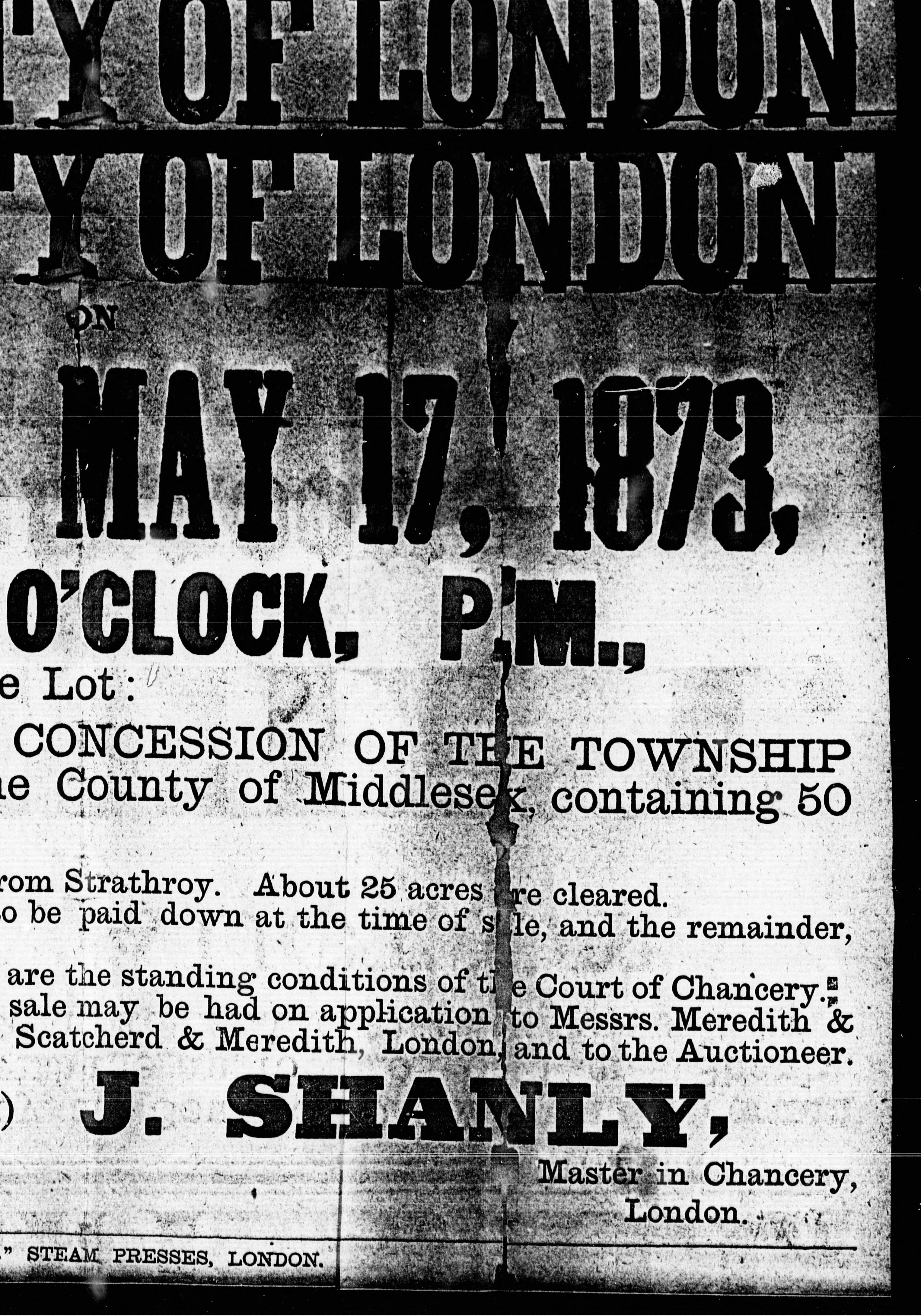 Signed: J. Shanly, master in chancery, London, Meredith and Meredith, vendor's solicitors.
