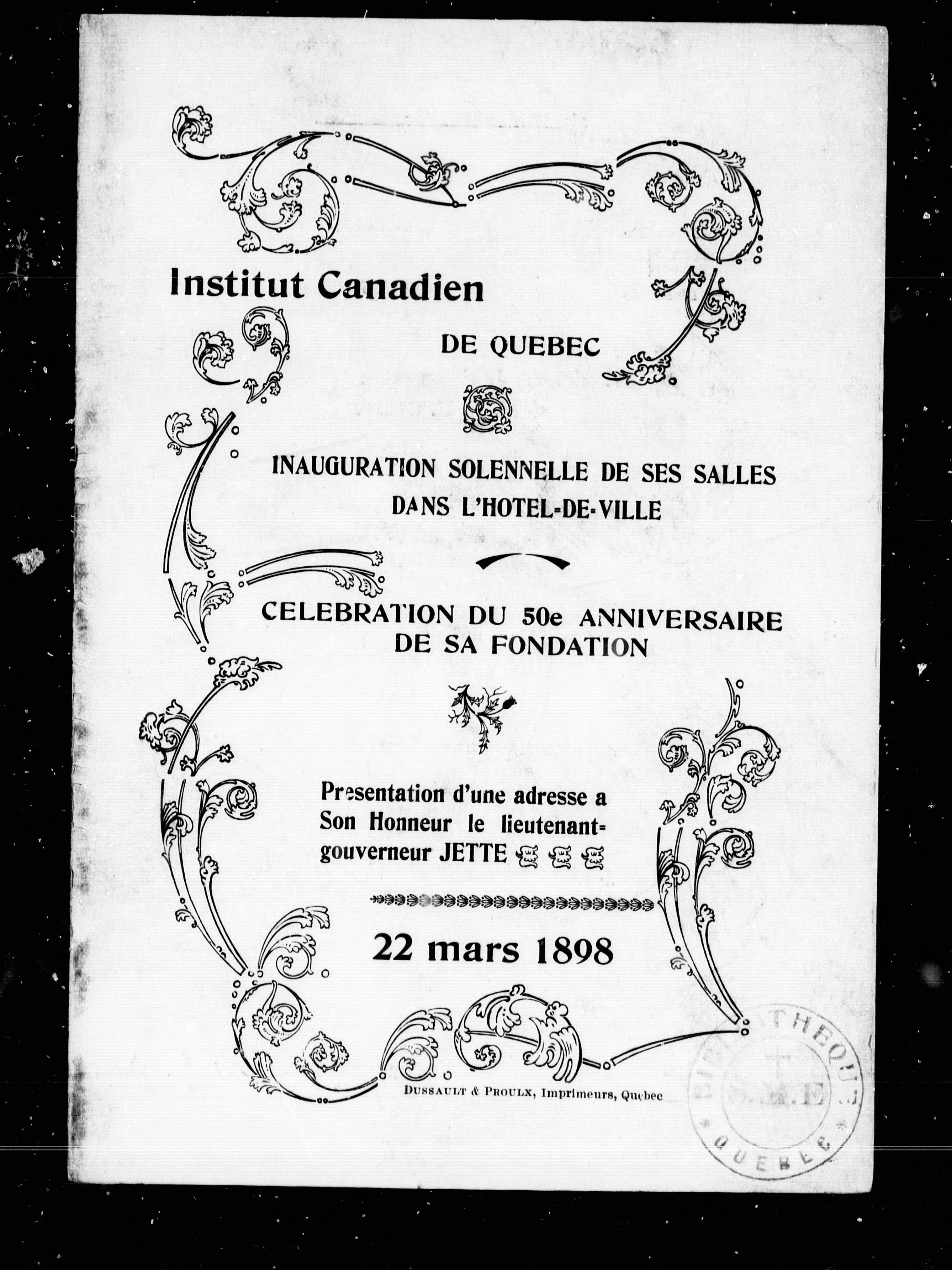 Institut canadien de Québec : inauguration solonnelle de ses salles dans l'Hôtel-de-ville, célébration du 50e anniversaire de sa fondation ..