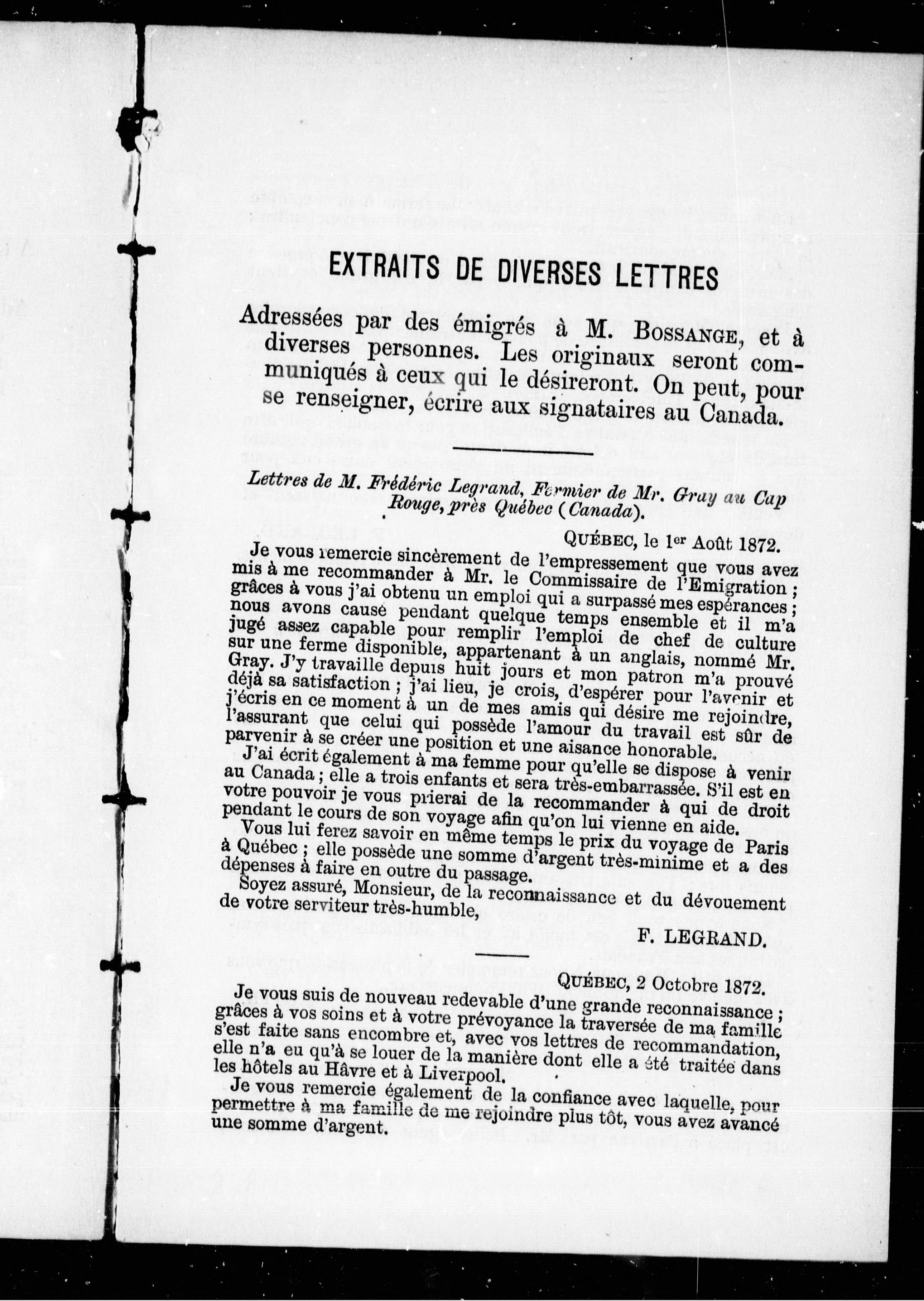 Extraits de diverses lettres adressées par des émigrés à M. Bossange agent du gouvernement canadien et a diverses personnes.
