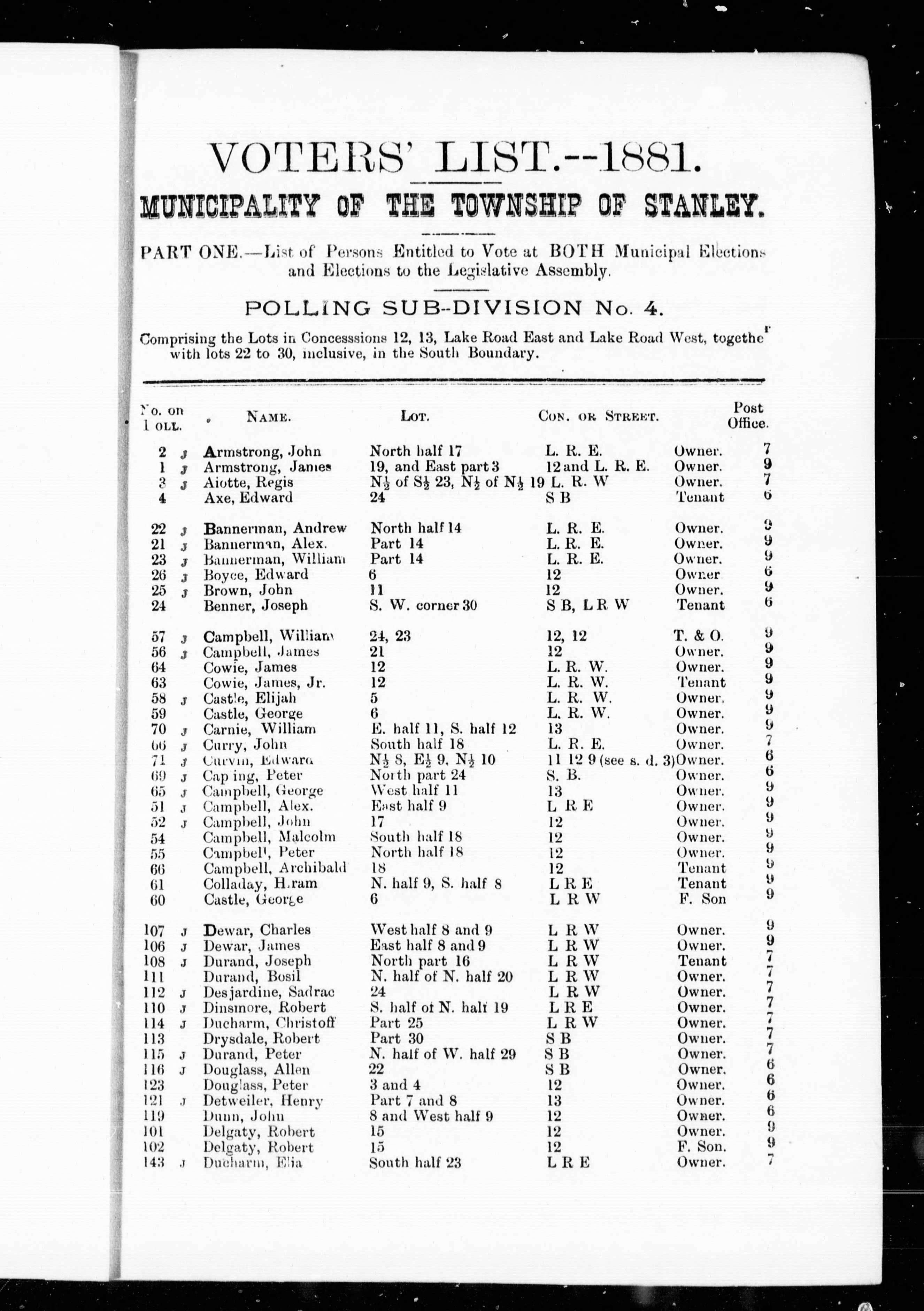 Voters' list, 1881 : township of Stanley, county of Huron : list of persons entitled to vote at municipal elections and elections to the Legislative Assembly.