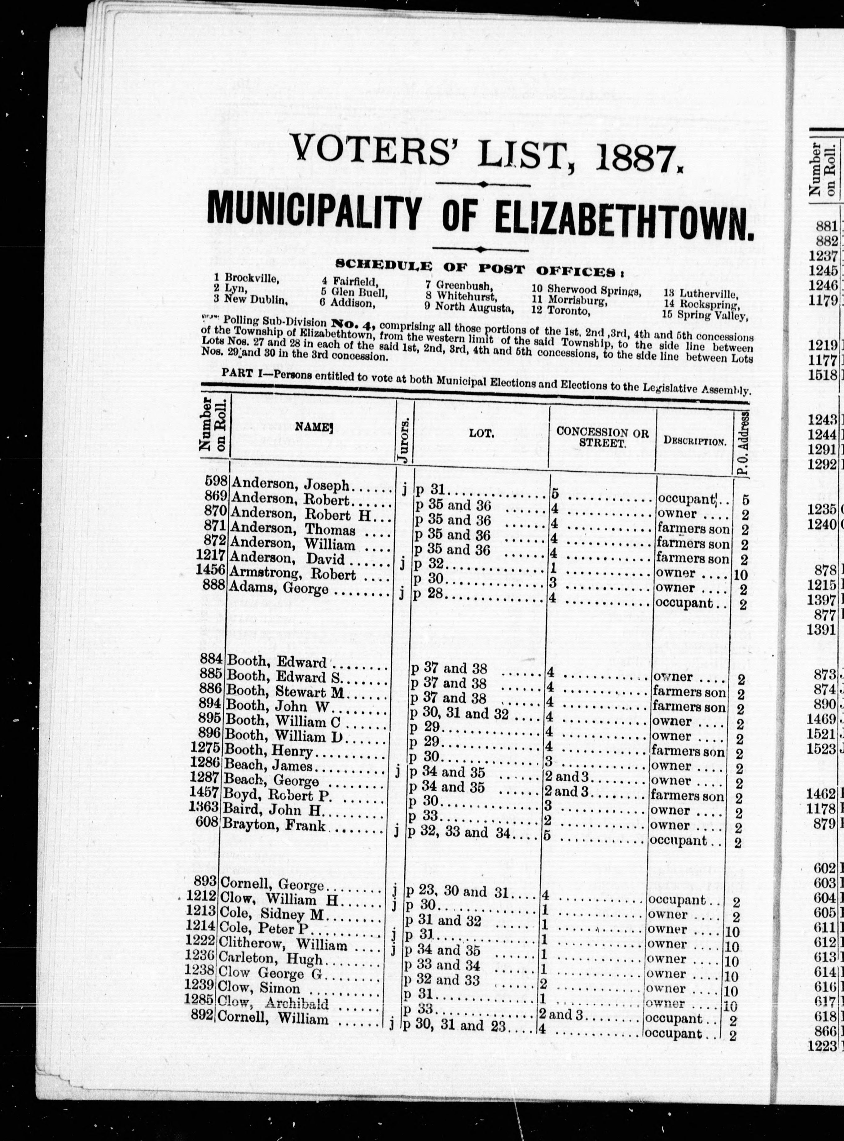 - Voters' list, 1887 : municipality of Elizabethtown.