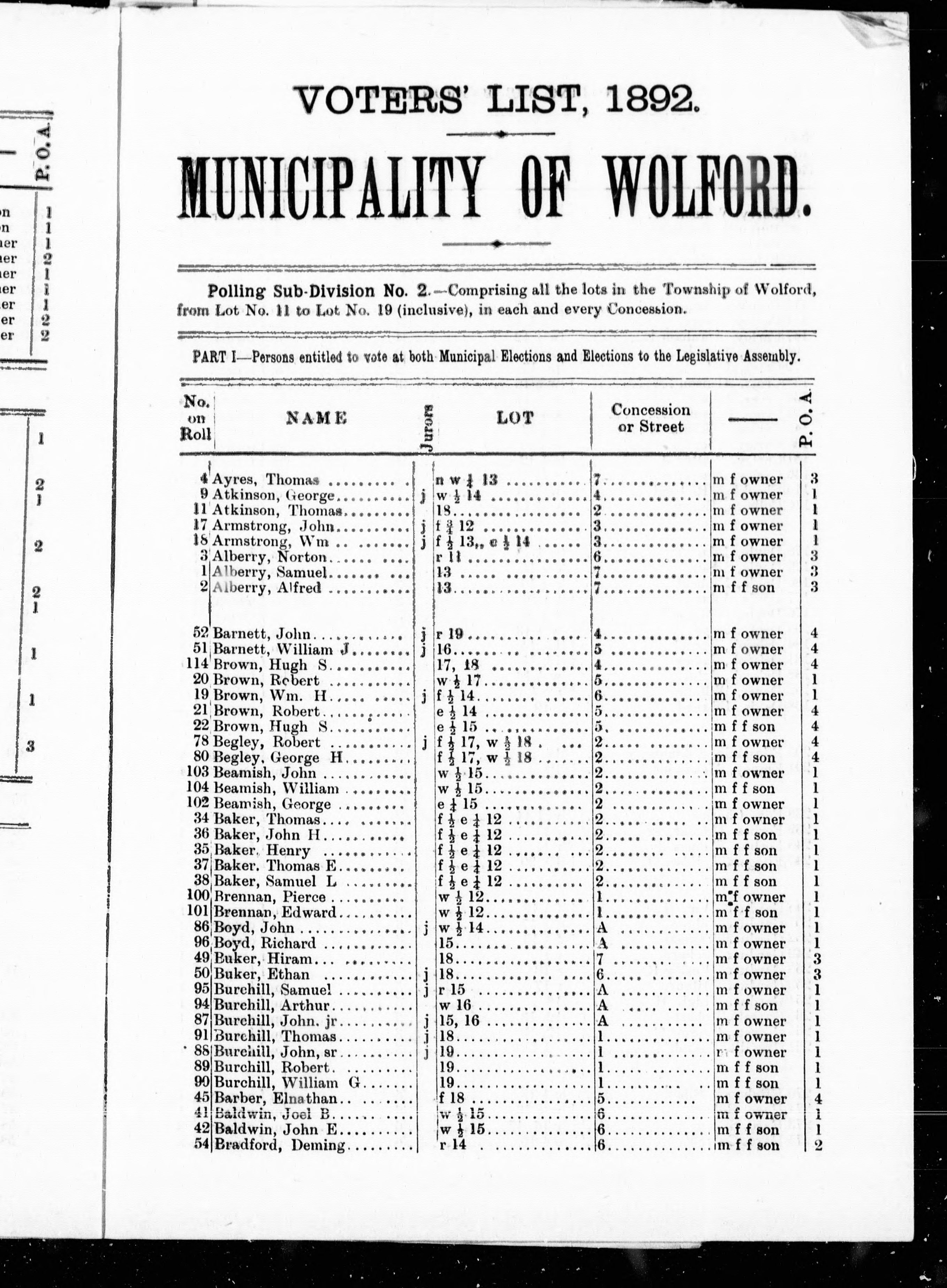 Voters' list, 1892, municipality of Wolford.