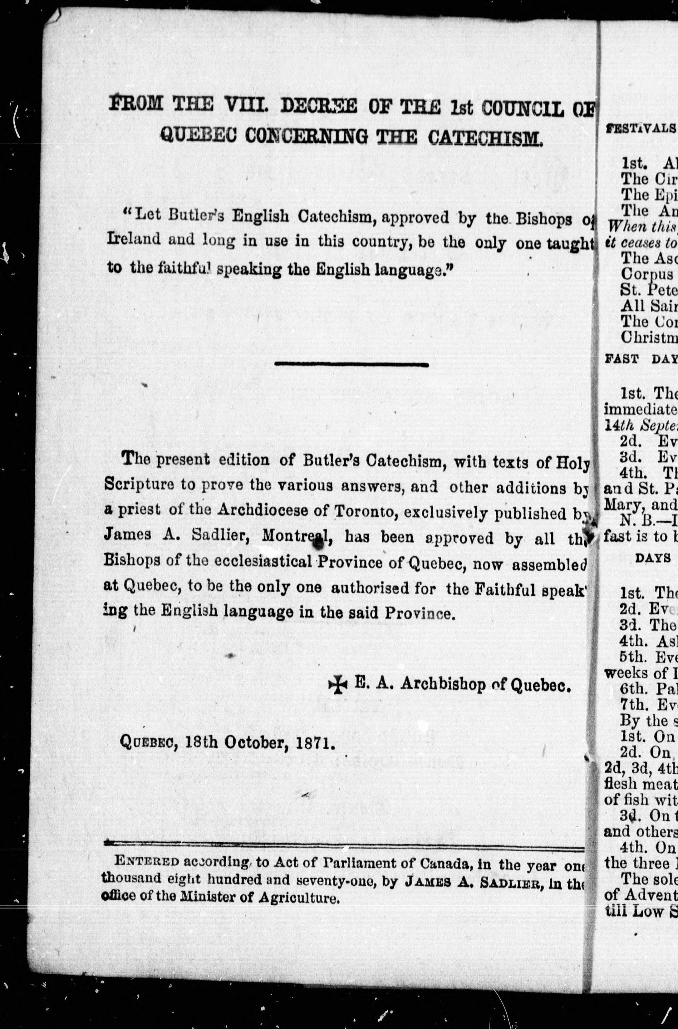 - The Most Reverend Doctor James Butler's catechism, with texts of Holy Scripture : authorized as the only English catechism for the ecclesiastical province of Quebec.