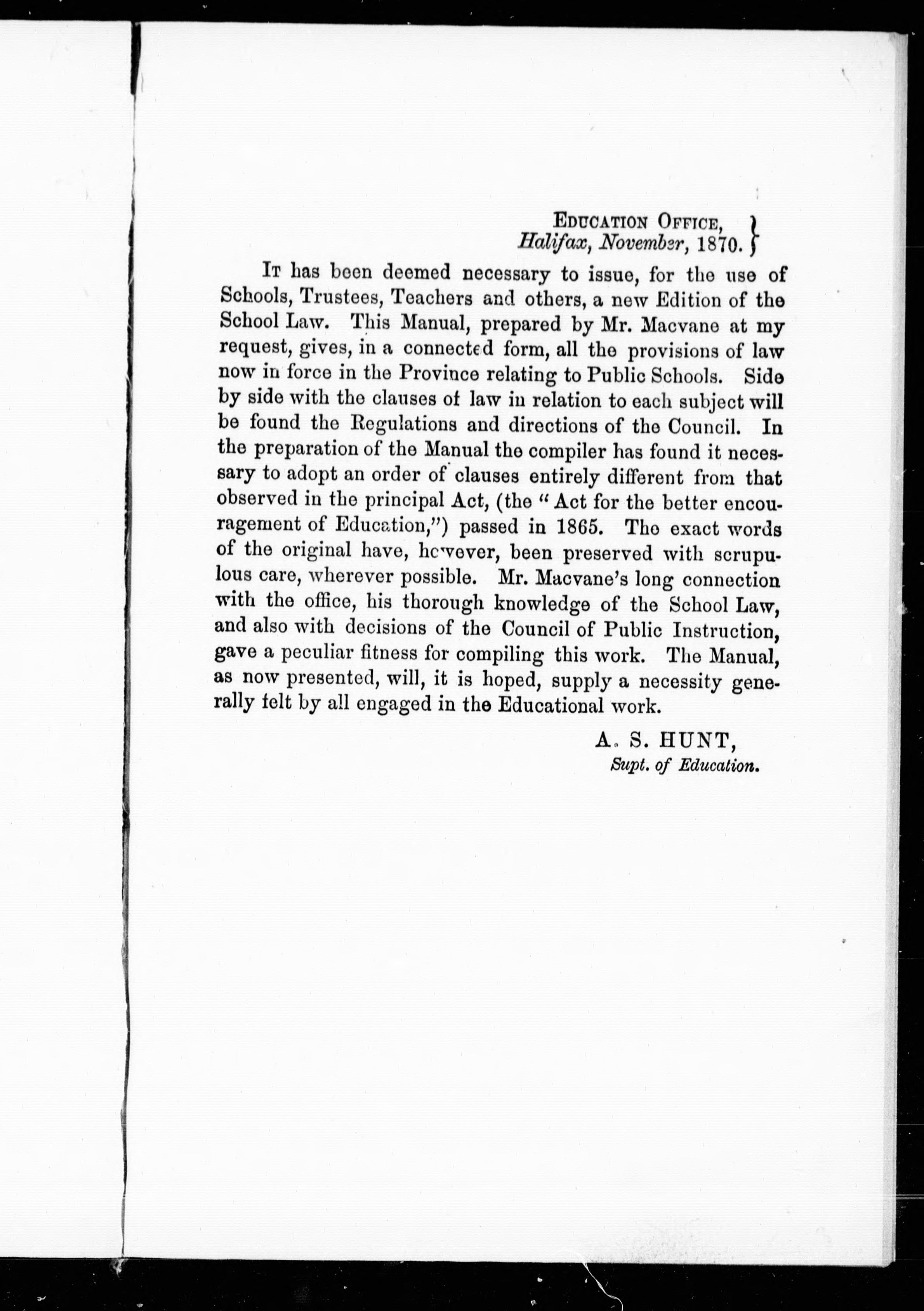 - Manual of the laws and regulations relating to the public schools of Nova Scotia : giving, in connected form, the provisions of the various acts referring to public schools, passed since the beginning of 1865, so far as the same are in force at this date (November, 1870); together with the regulations of the Council of Public Instruction
