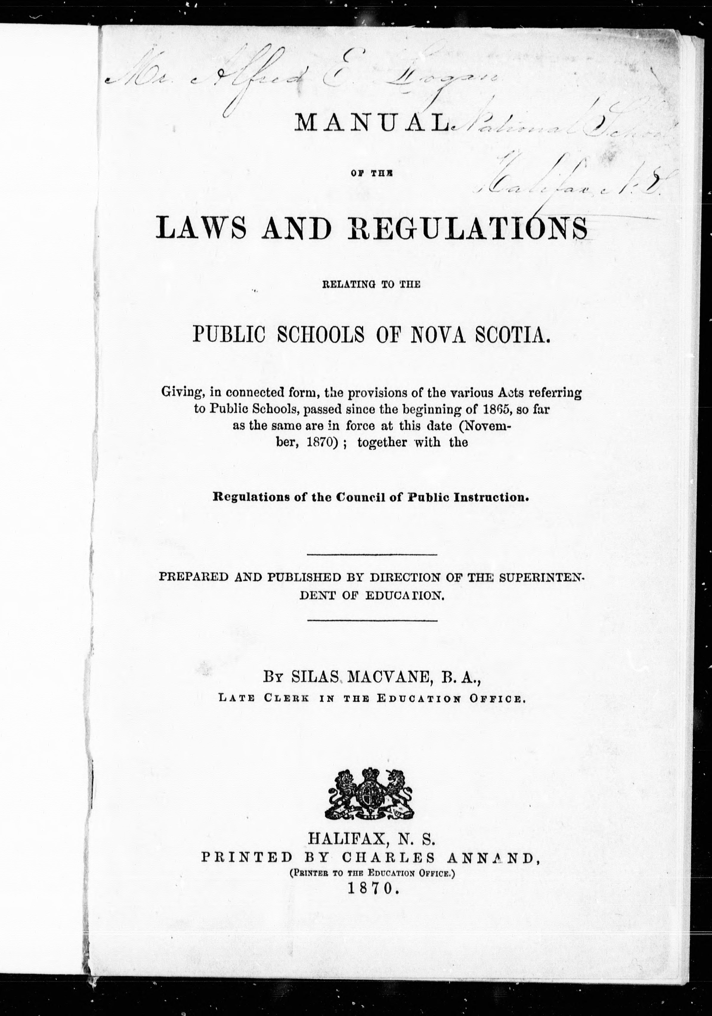 - Manual of the laws and regulations relating to the public schools of Nova Scotia : giving, in connected form, the provisions of the various acts referring to public schools, passed since the beginning of 1865, so far as the same are in force at this date (November, 1870); together with the regulations of the Council of Public Instruction