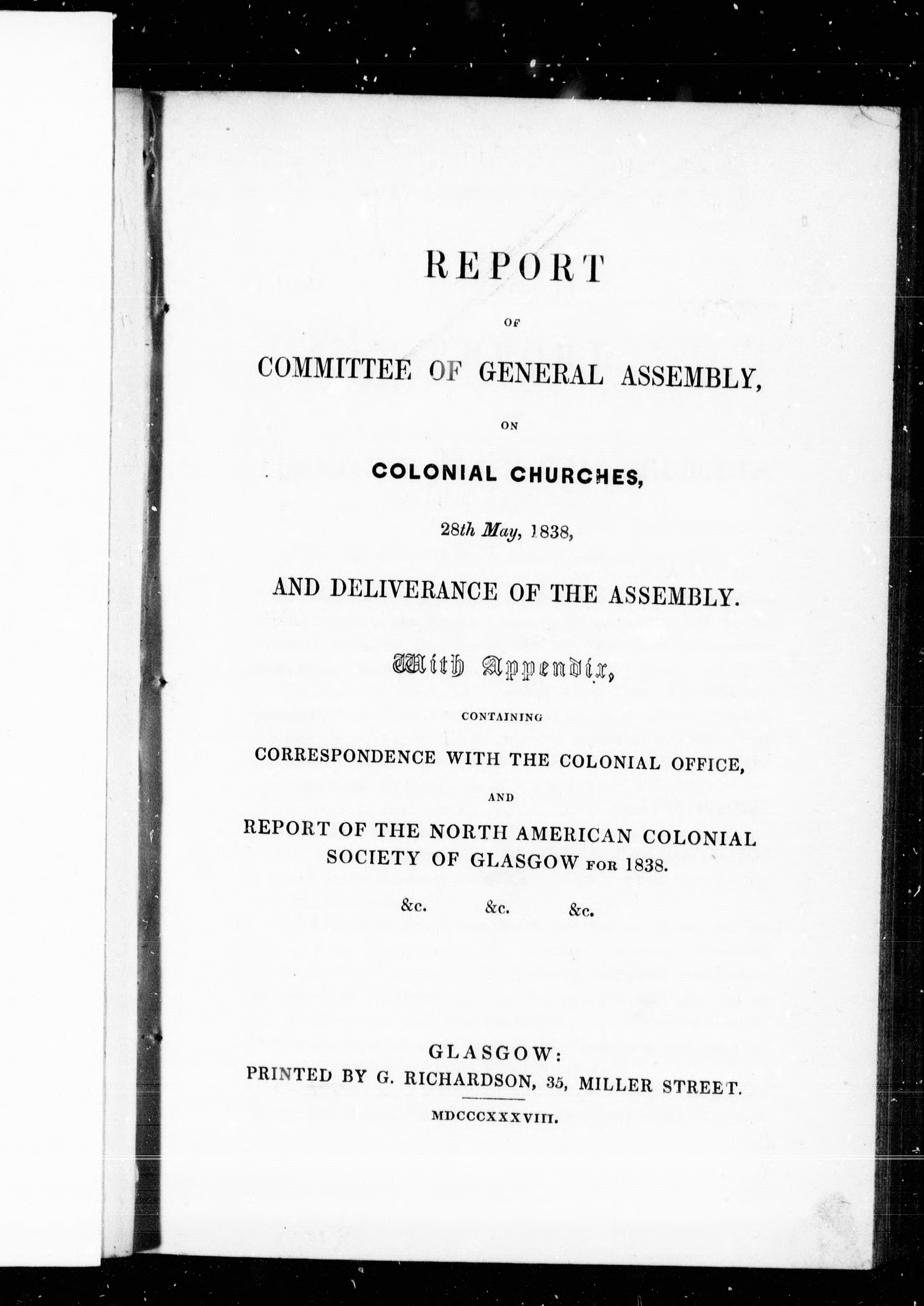 Report of Committee of General Assembly on Colonial Churches, 28th May 1838, and deliverance of the Assembly : with appendix, containing correspondence with the Colonial Office and report of the North American Colonial Society of Glasgow for 1838, & c. &c. &c. - Adresse bibliographique