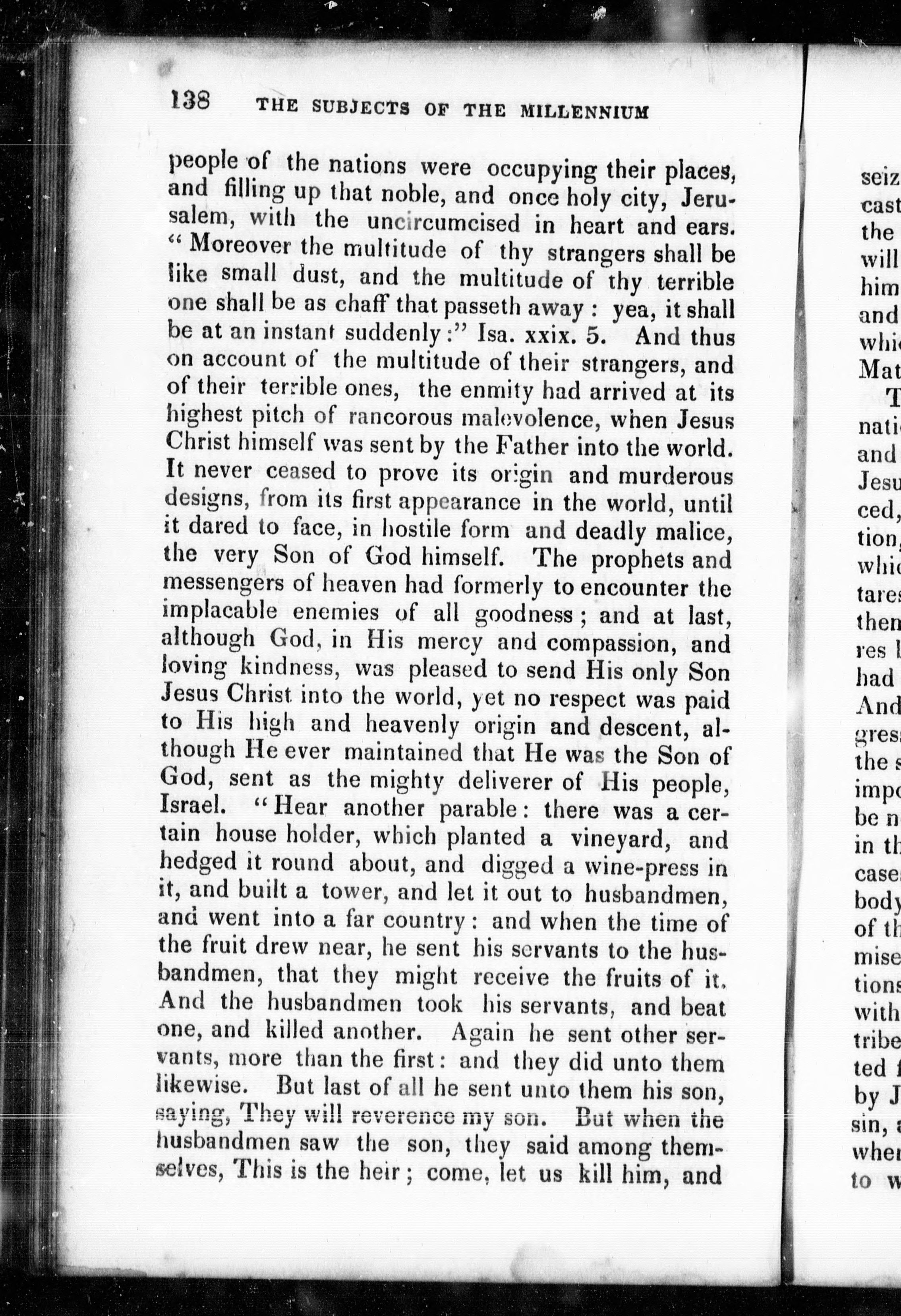 The subjects of the millennium : traced in their downward progress from their ancestry through the three pre-millenial dispensations : together with a scriptural view of the New Jersualem, coming of Messiah, sacred numbers, and signs of the times, the end of the world, and last judgment, and scriptural views of the Millennial Church
