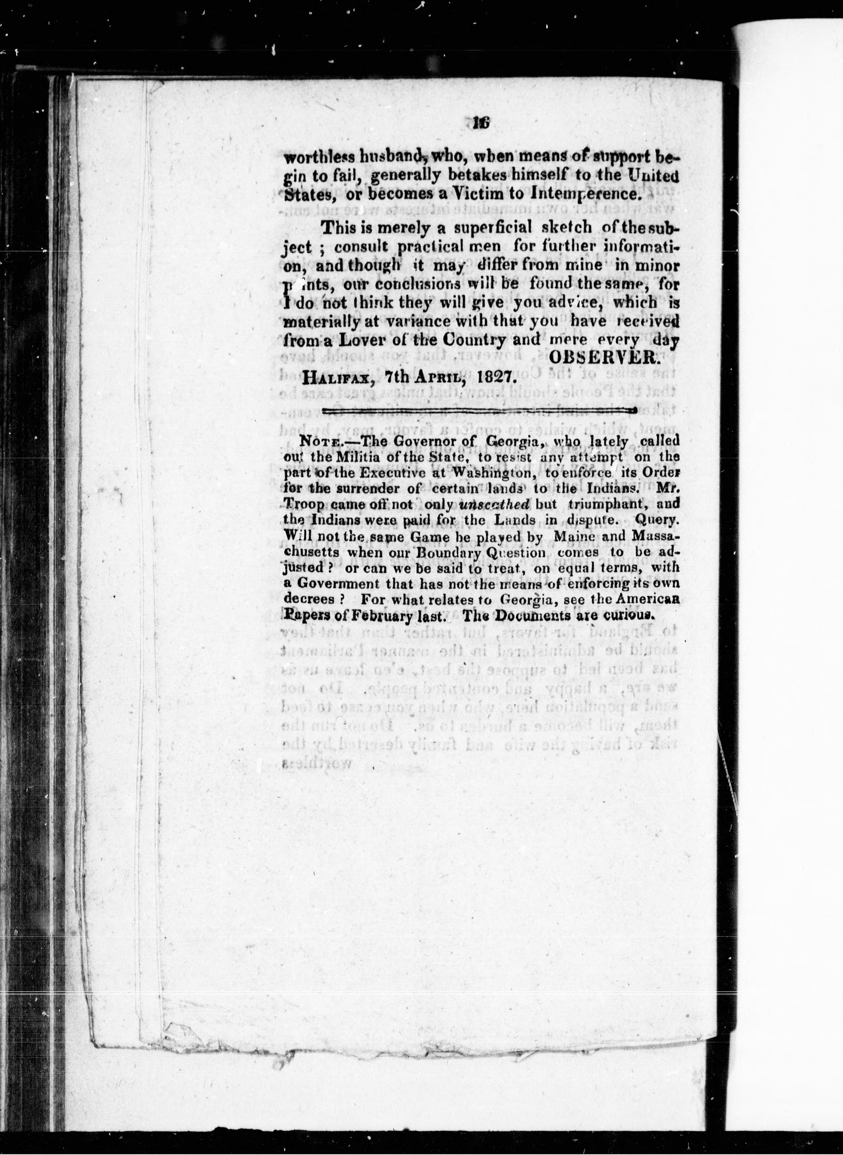 Signed and dated: Observer, Halifax, 7th April, 1827.