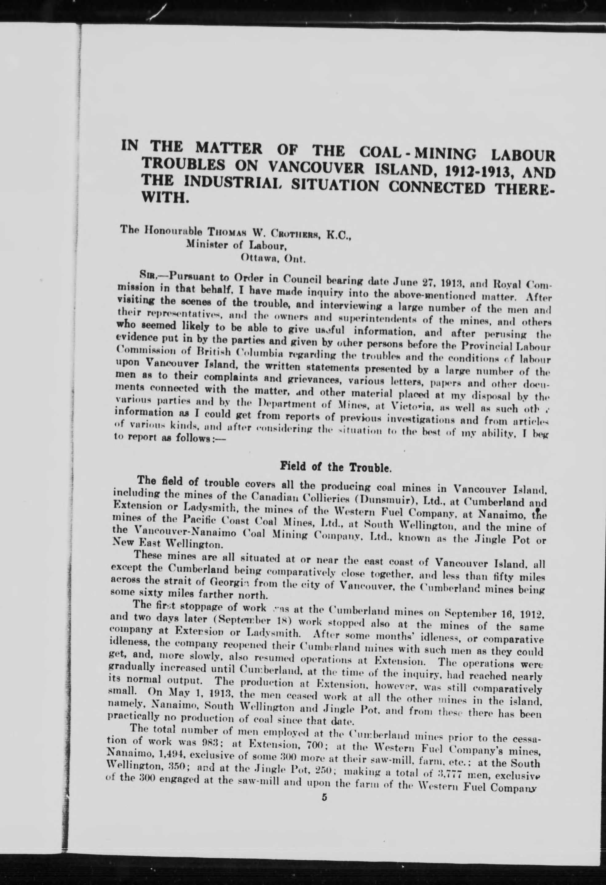 In the matter of the coal-mining labour troubles on Vancouver Island, 1912-1913, and the industrial situation connected therewith