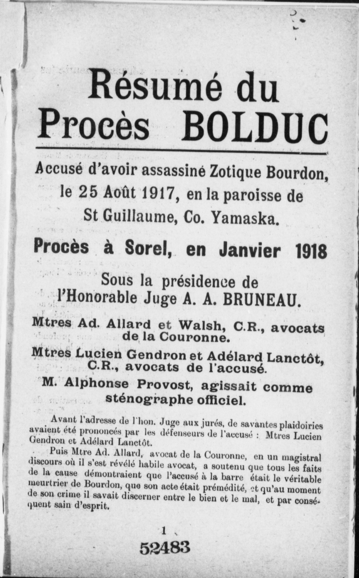 - Résumé du procés Bolduc et son exécution à Sorel, le 5 avril 1918.