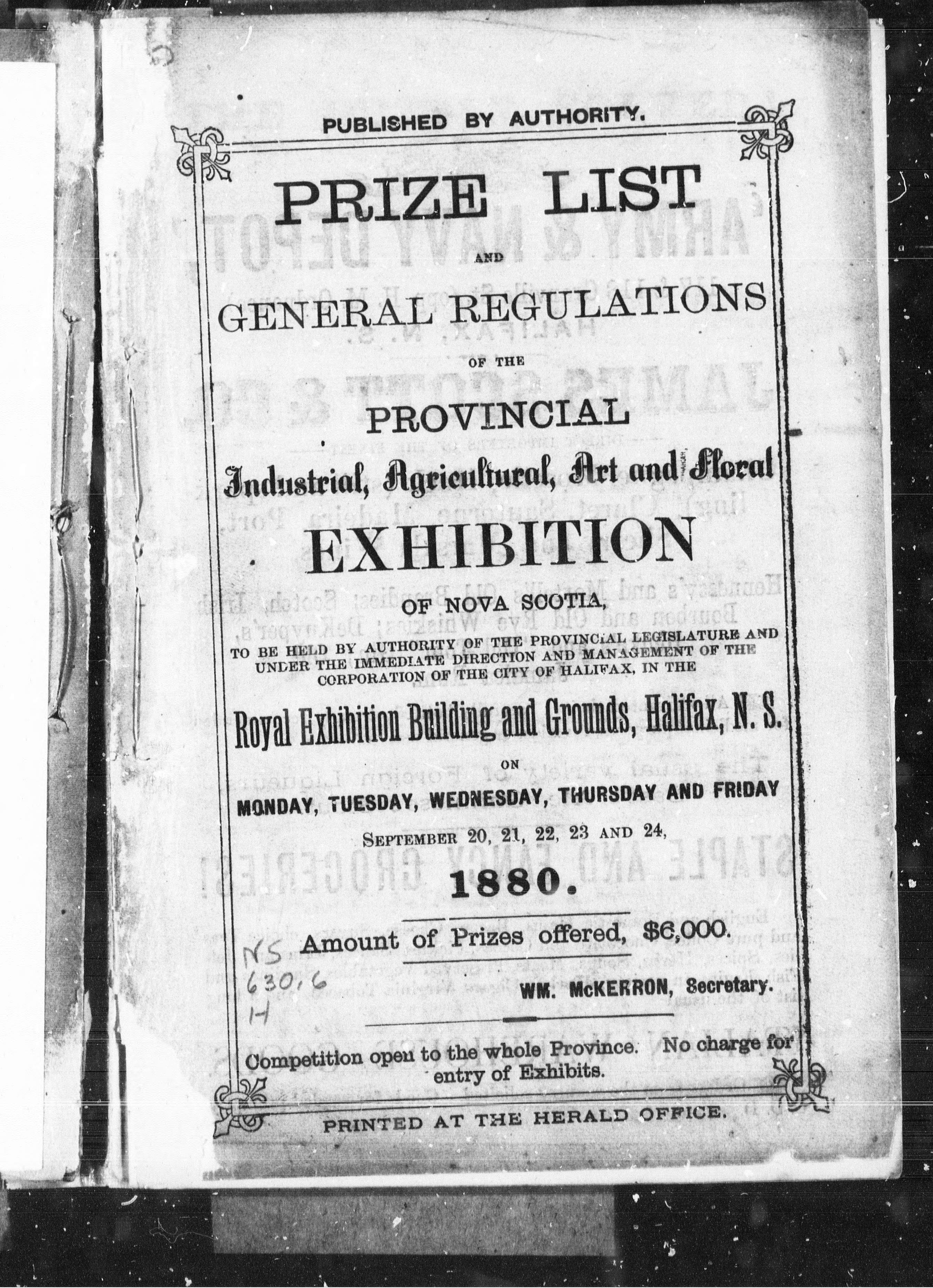 Prize list and general regulations of the Provincial Industrial, Agricultural, Art and Floral Exhibition of Nova Scotia : to be held by authority of the Provincial Legislature ... in the Royal Exhibition Building and grounds, Halifax, N.S., on Monday, Tuesday, Wednesday, Thursday and Friday, September 20, 21, 22, 23 and 24, 1880. - Adresse bibliographique