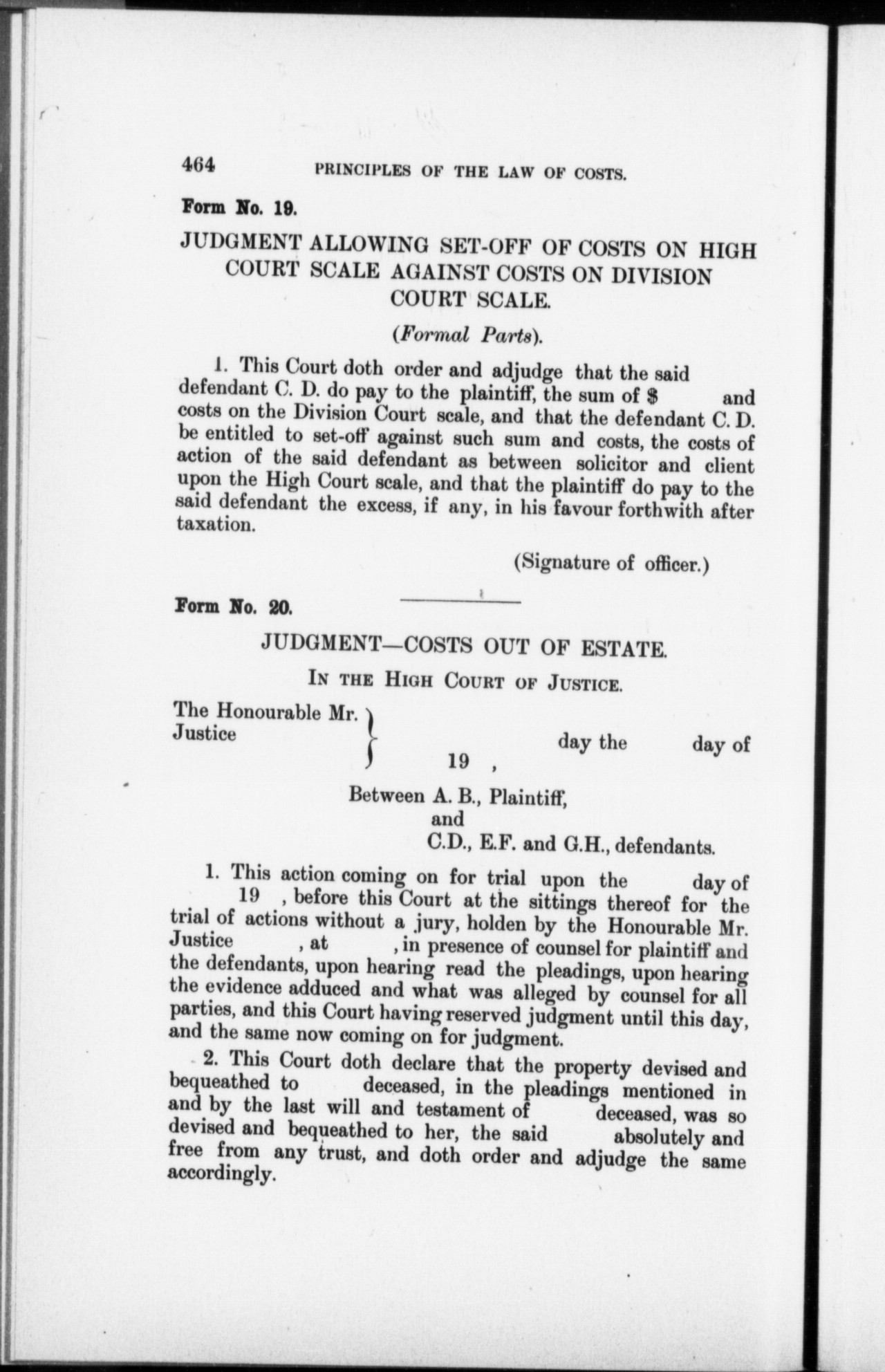 The principles of the law of costs and digest of cases applicable thereto, with tariffs of fees, precedents of bills of costs, and forms :