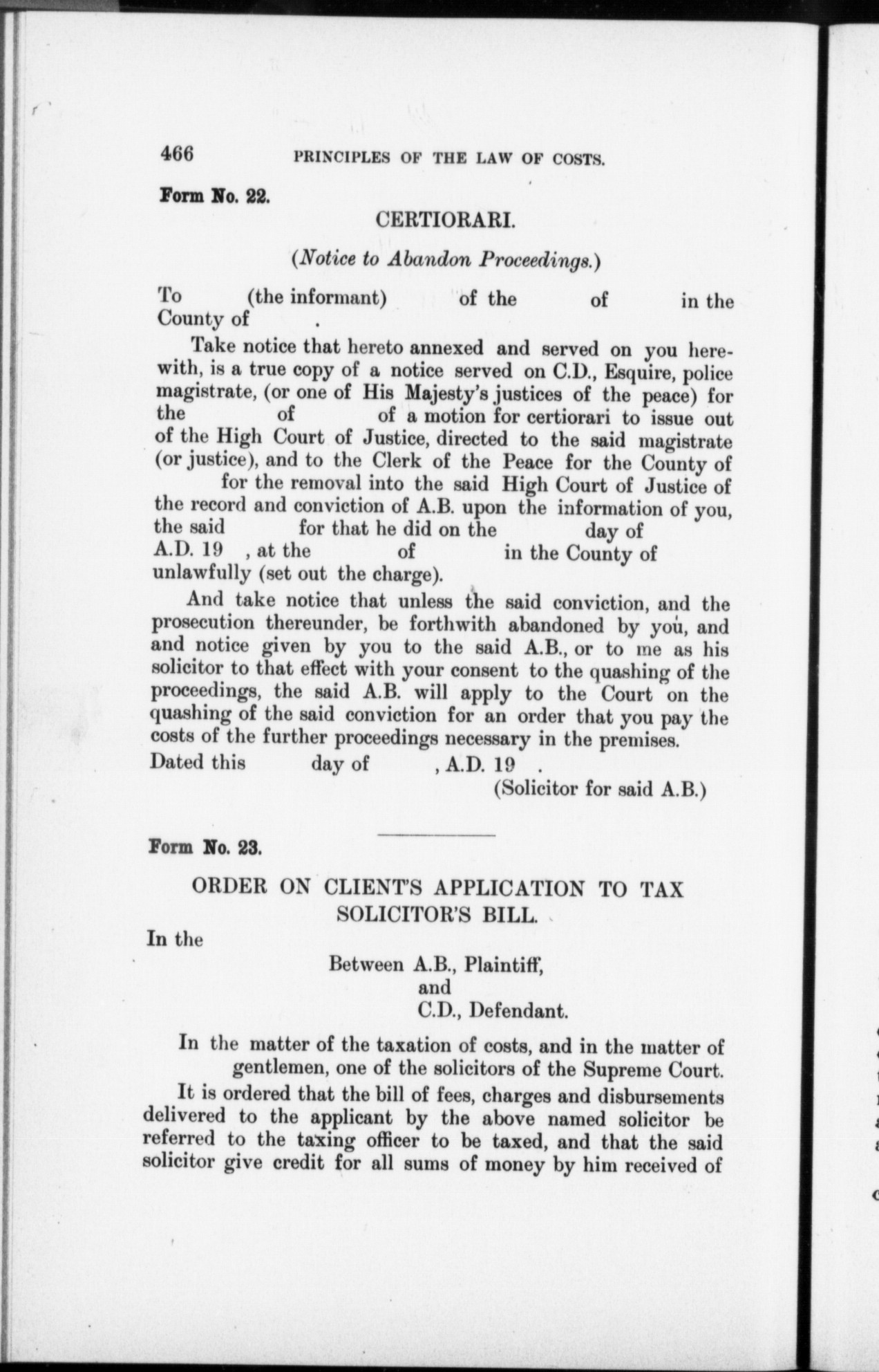 The principles of the law of costs and digest of cases applicable thereto, with tariffs of fees, precedents of bills of costs, and forms : also miscellaneous tariffs of fees