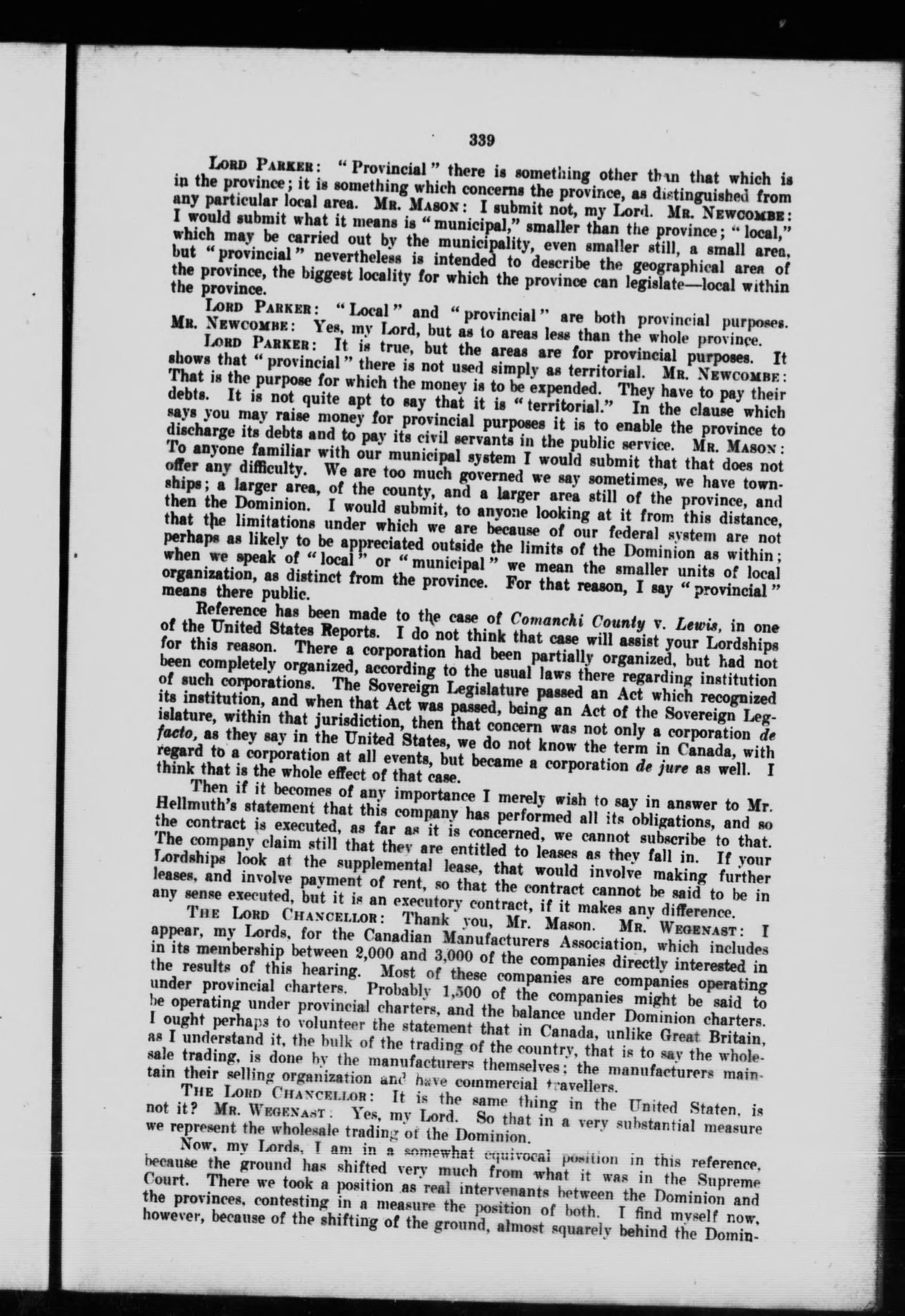 Canadian companies : proceedings in the Judicial Committee of the Privy Council (December 8-17, 1915) in the appeals of the Attorney-General for Canada v. the Attorney-General for Alberta (1916) A.C. 588, insurance reference; the Bonanza Creek Gold Mining Company v. the King (1916) A.C. 566; Attorney-General for Ontario v. Attorney-General for Canada (1916) A.C. 598, companies reference; to which is added the judgments of the Judicial Committee in these cases and in the appeal of the John Deere Plow Company v. Wharton (1915) A. C. and an index ; also a review of the said decisions by Edward Robert Cameron.