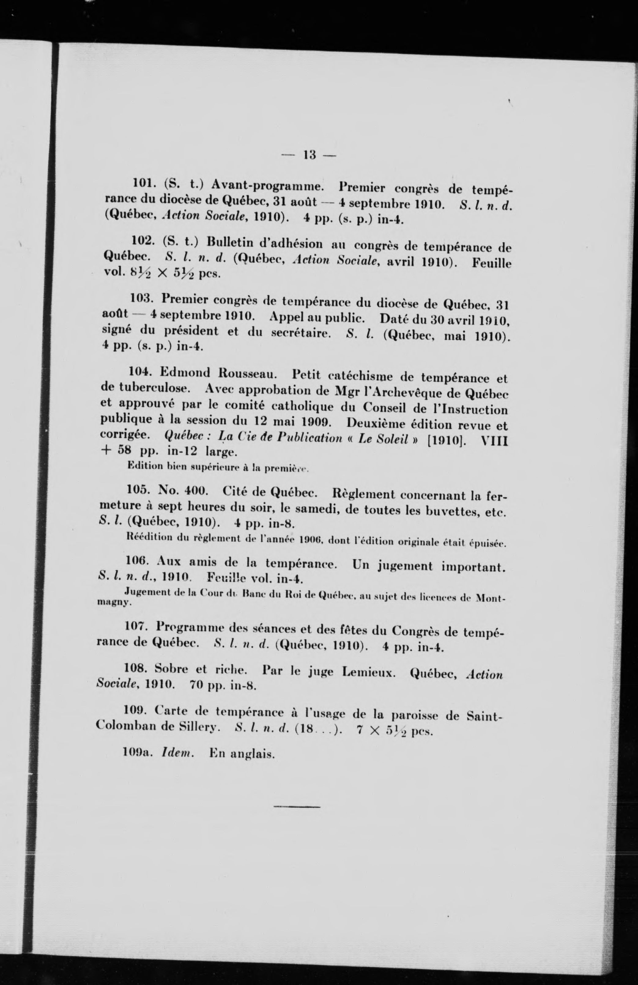 - Catalogue de l'exposition anti-alcoolique du premier Congrès de tempérance du diocèse de Québec : tenu à Québec du 31 août au 4 septembre 1910