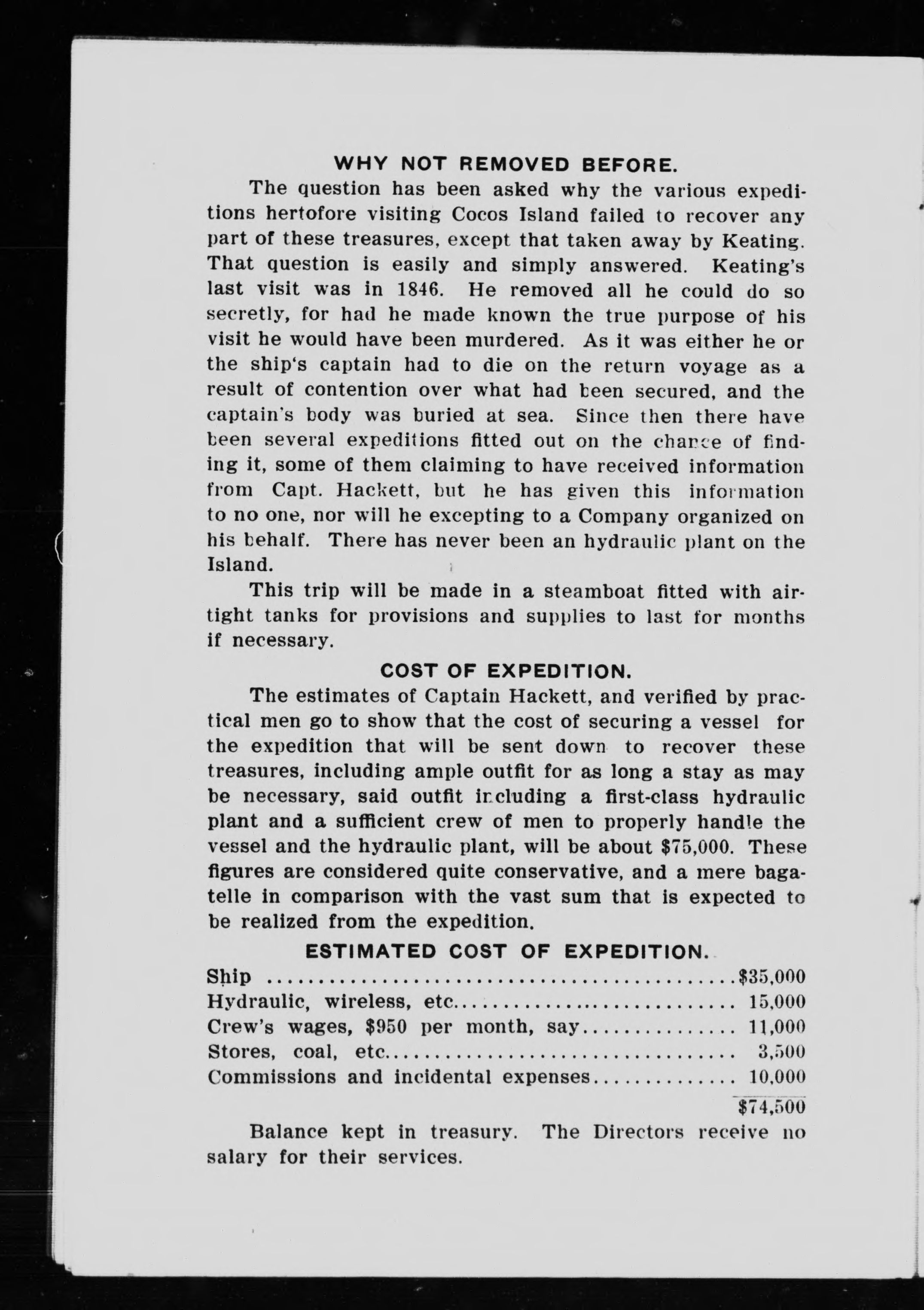 Prospectus dated August 16th 1910 : Cocos Island Hydraulic and Treasure Company, Ltd. - Published