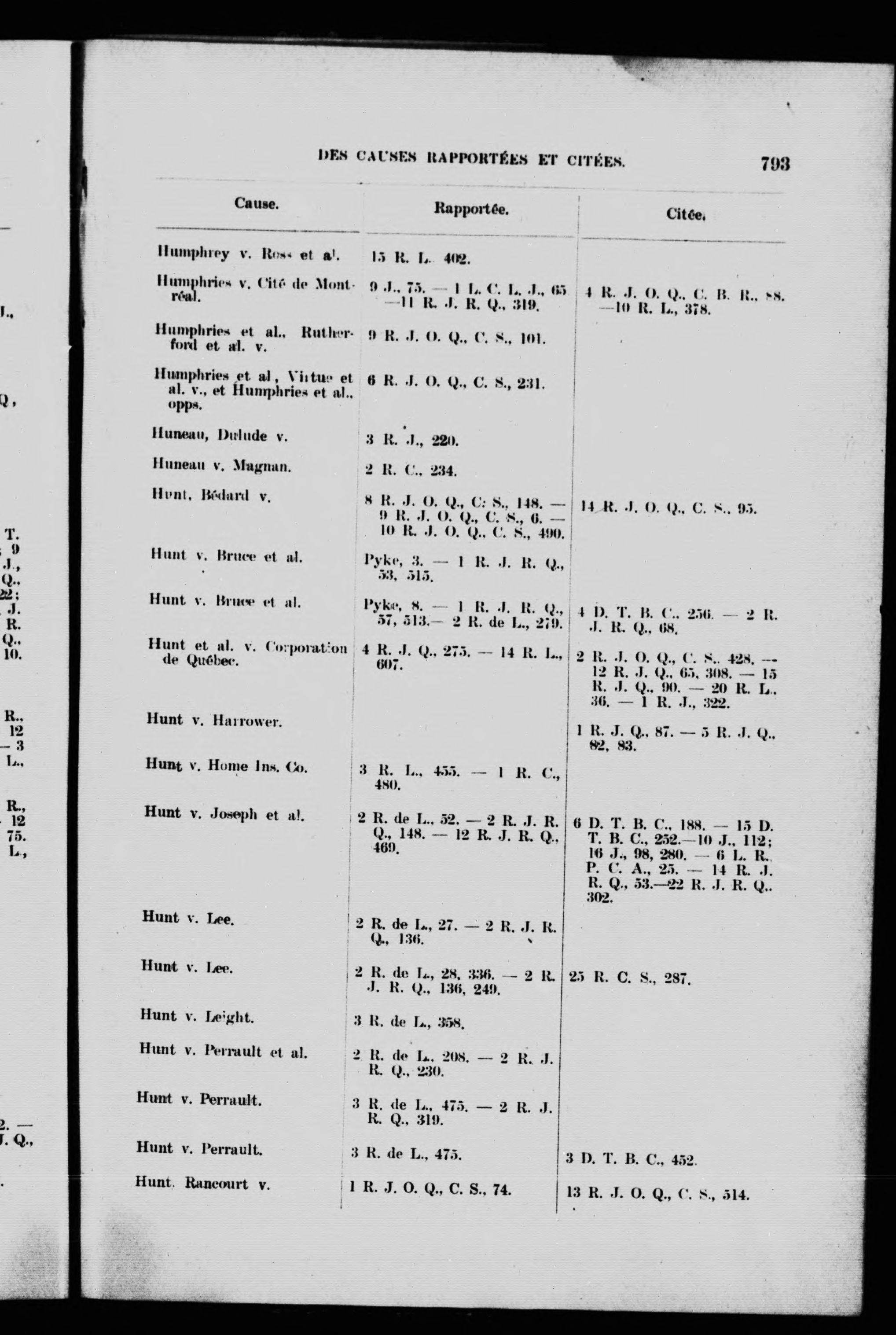 Faux-titre: Table alphabétique des causes rapportées et citées de la province de Québec.