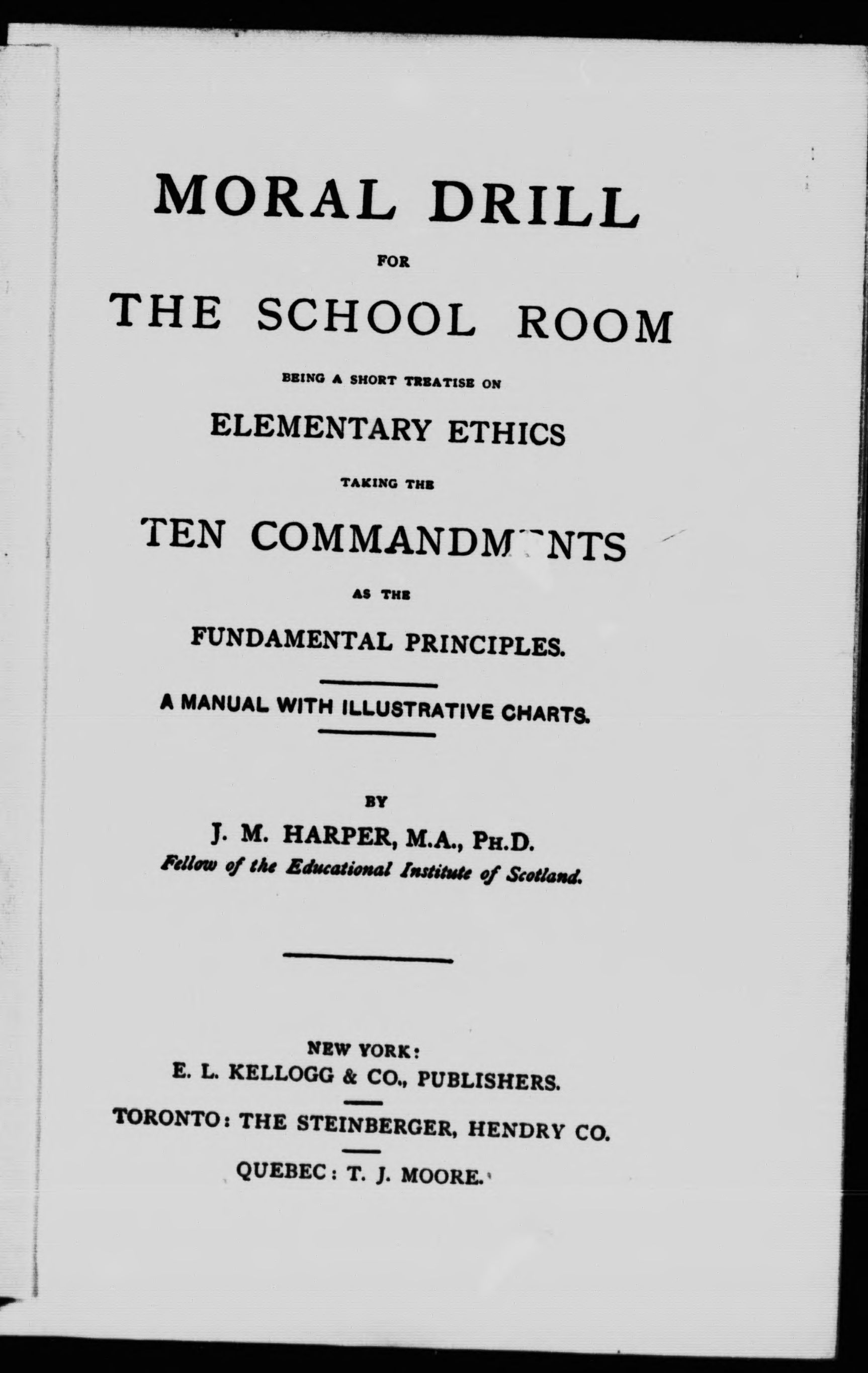 - Moral drill for the school room : being a short treatise on elementary ethics taking the Ten commandments as the fundamental principles : a manual with illustrative charts