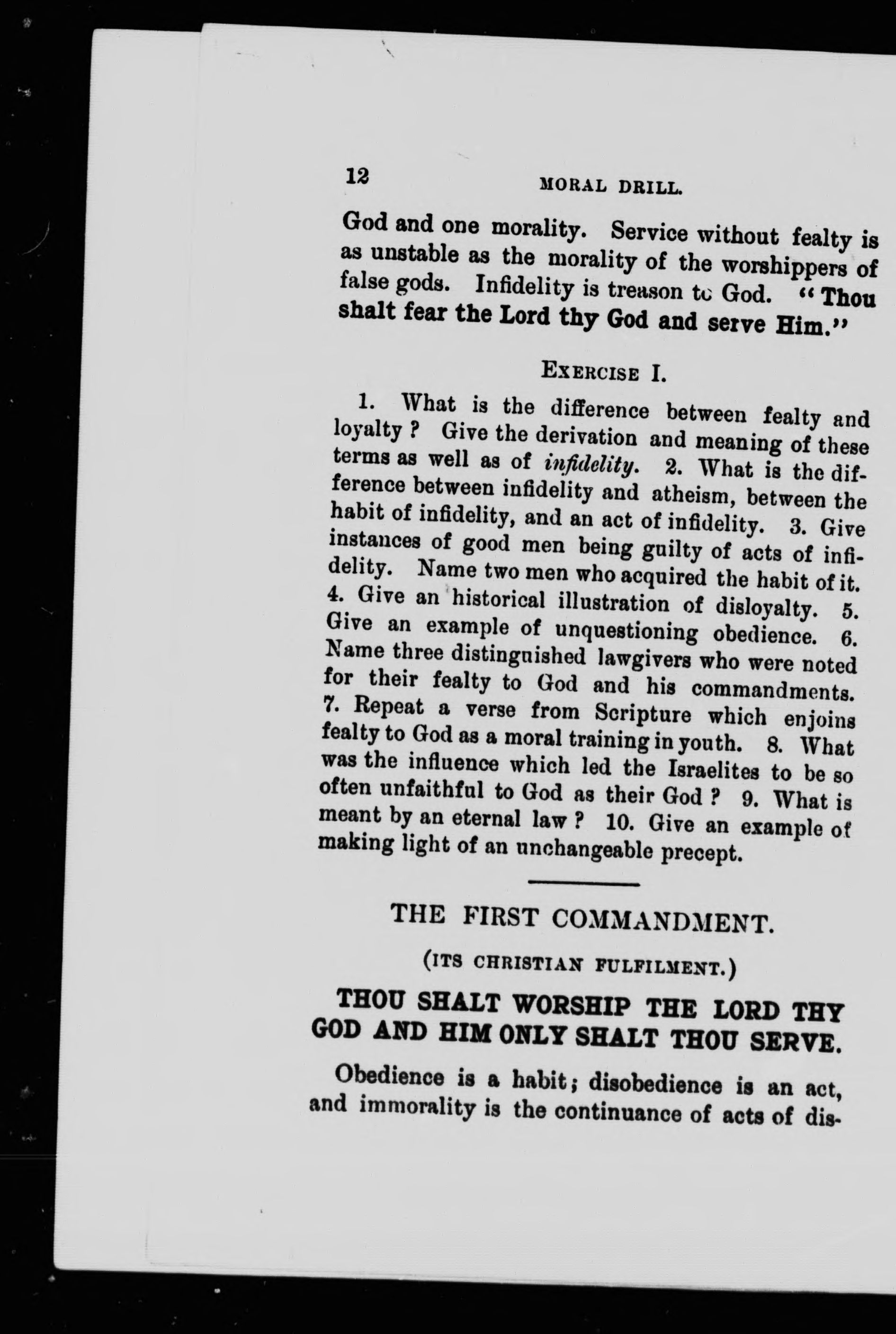 Moral drill for the school room : being a short treatise on elementary ethics taking the Ten commandments as the fundamental principles : a manual with illustrative charts