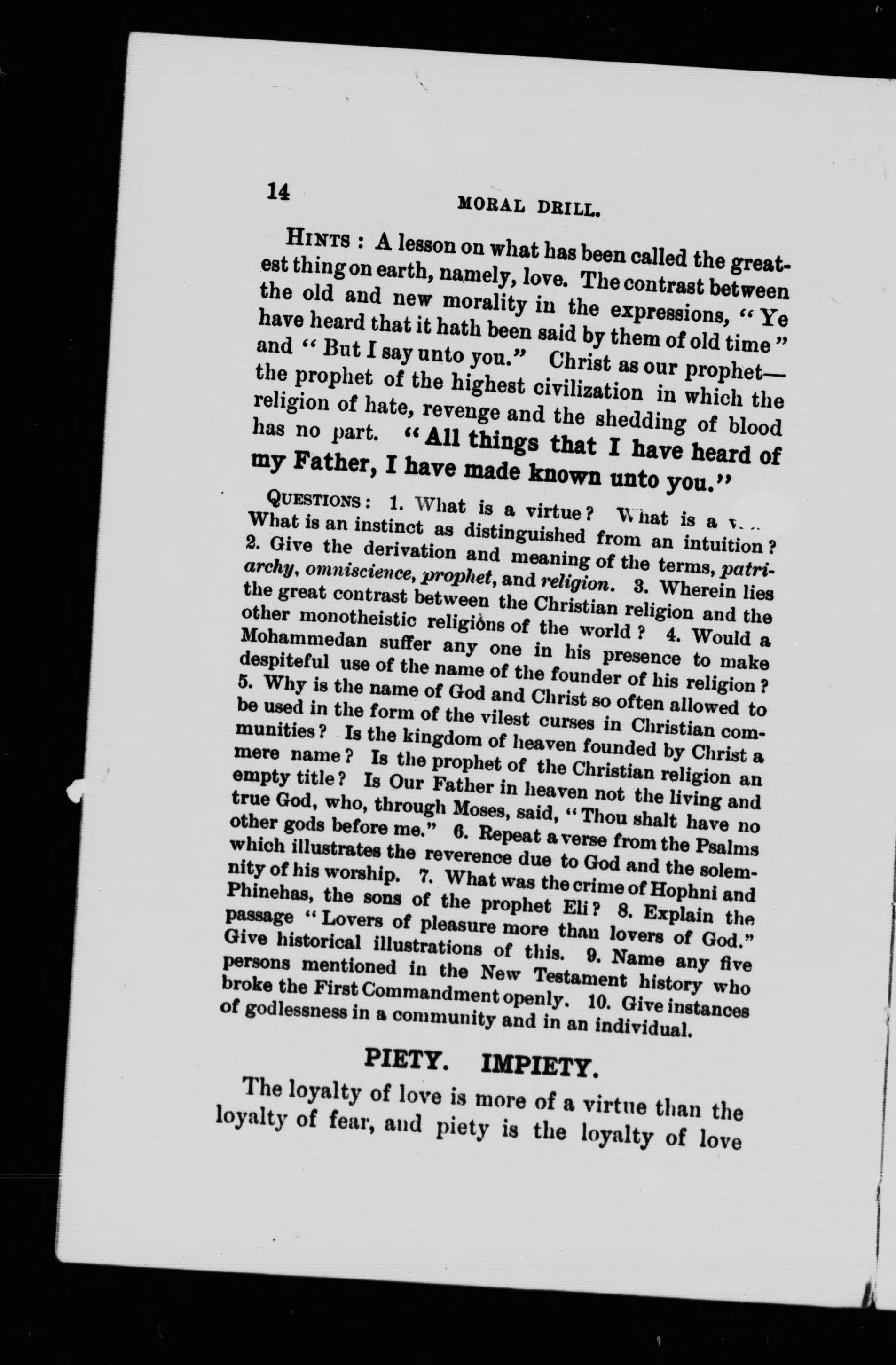 Moral drill for the school room : being a short treatise on elementary ethics taking the Ten commandments as the fundamental principles : a manual with illustrative charts