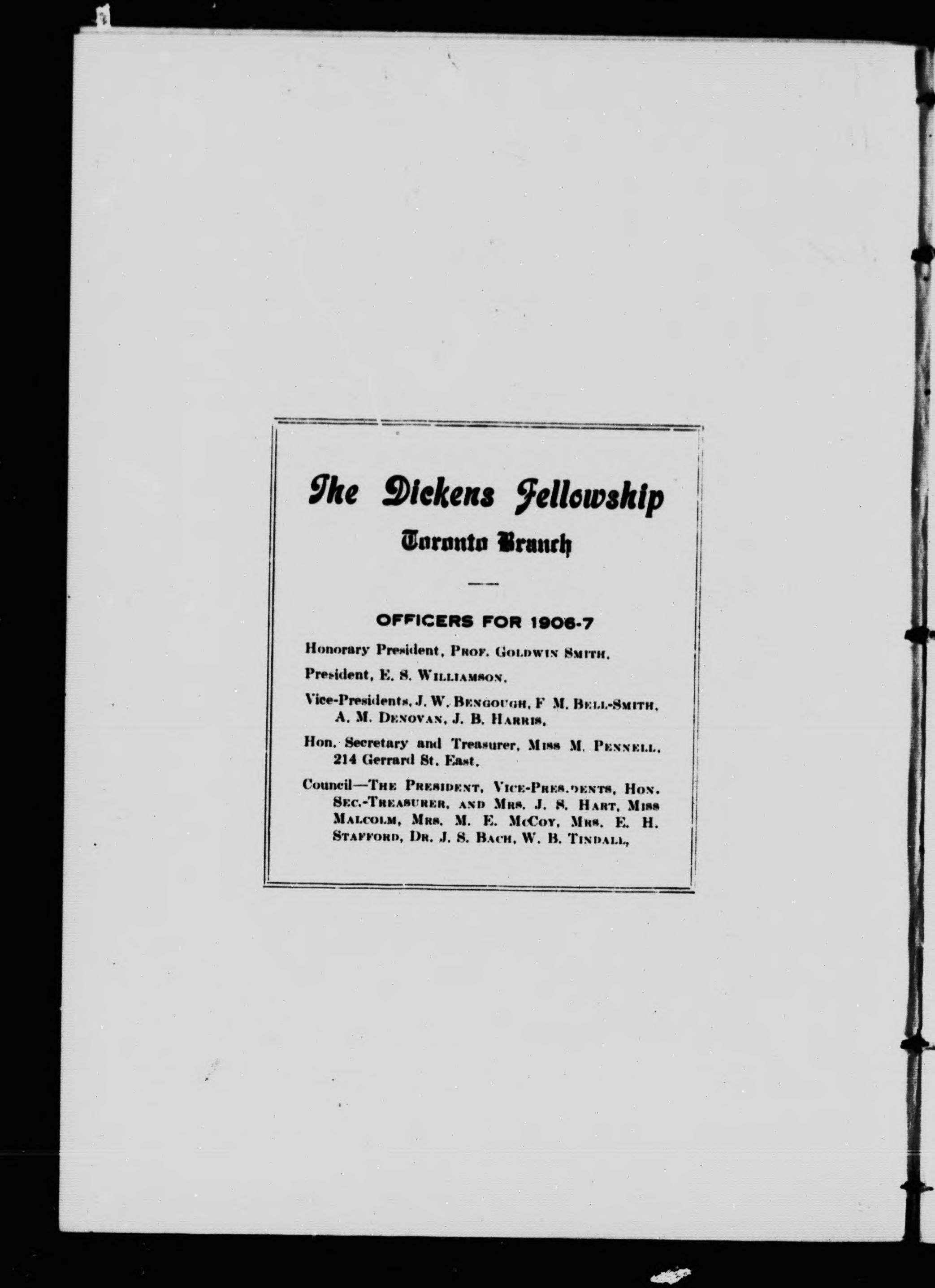 "As presented by the Dickens Fellowship Company of Players at Toronto, May 9, 10, 15, and 28, 1907"