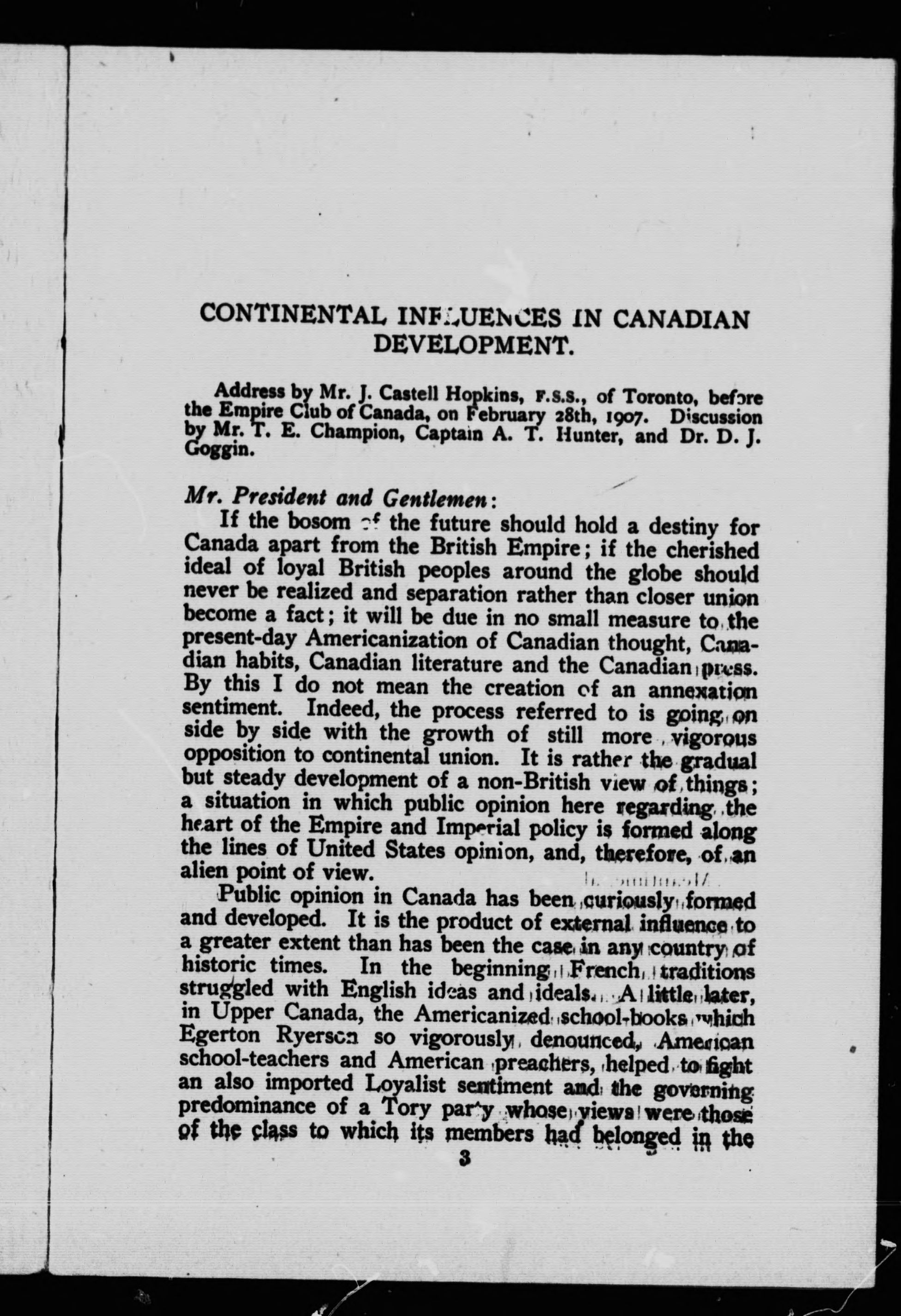 "Address by Mr. J. Castell Hopkins ... before the Empire Club of Canada, on February 28th, 1907. Discussion by Mr. T.E. Champion, Captain A.T. Hunter, and Dr. D.J. Goggin"--p. 3.