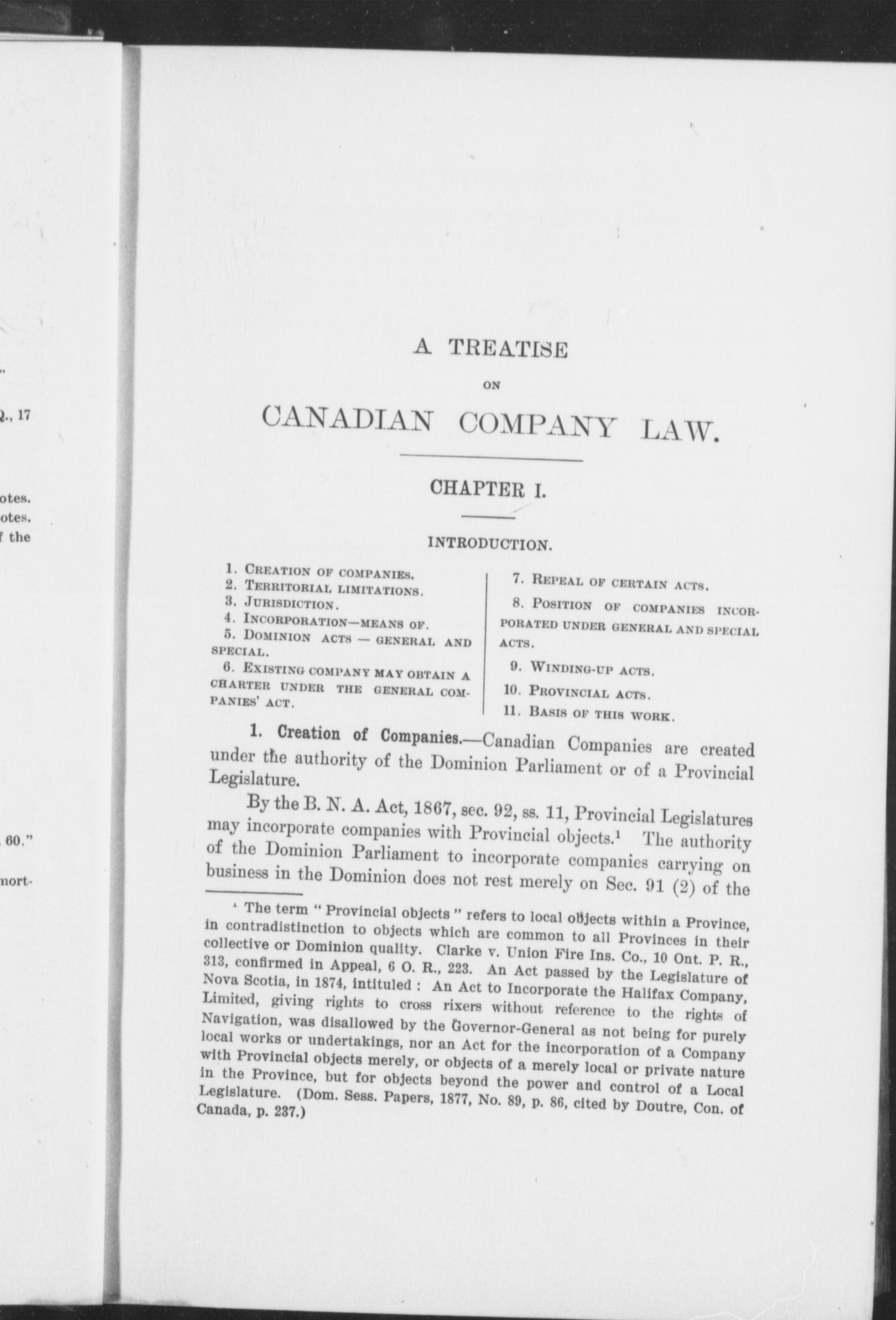 A treatise on Canadian company law : containing a commentary on the Companies Act of the Dominion, with incidental reference to the law of the various provinces, with full notes of the jurisprudences and appendices of the statutes and useful forms