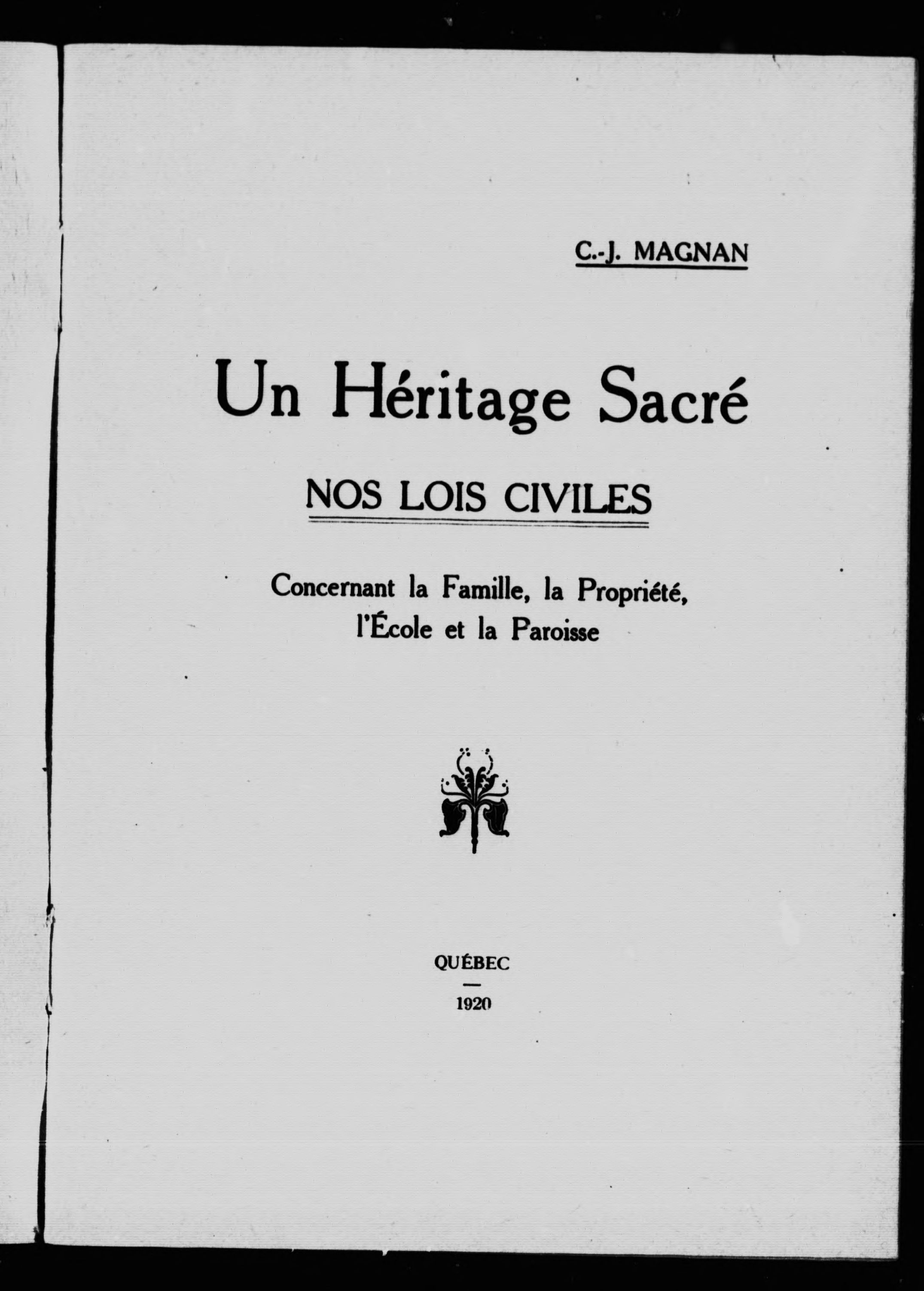- Un héritage sacré : nos lois civiles concernant la famille, la propriété, l'école et la paroisse