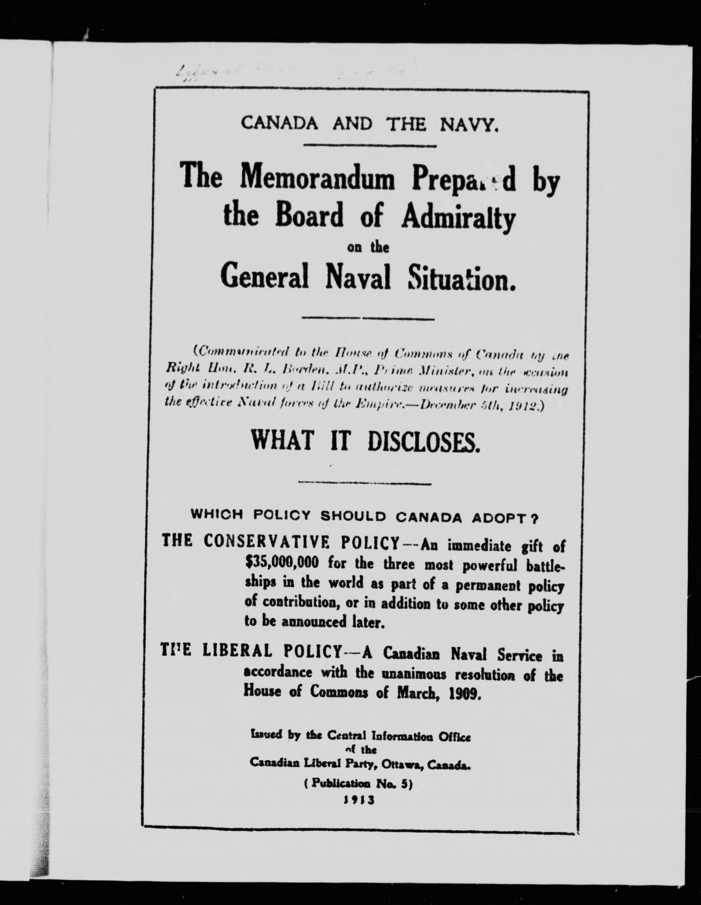 Canada and the navy : the memorandum prepared by the Board of Admiralty on the general naval situation ... what it discloses. - Published
