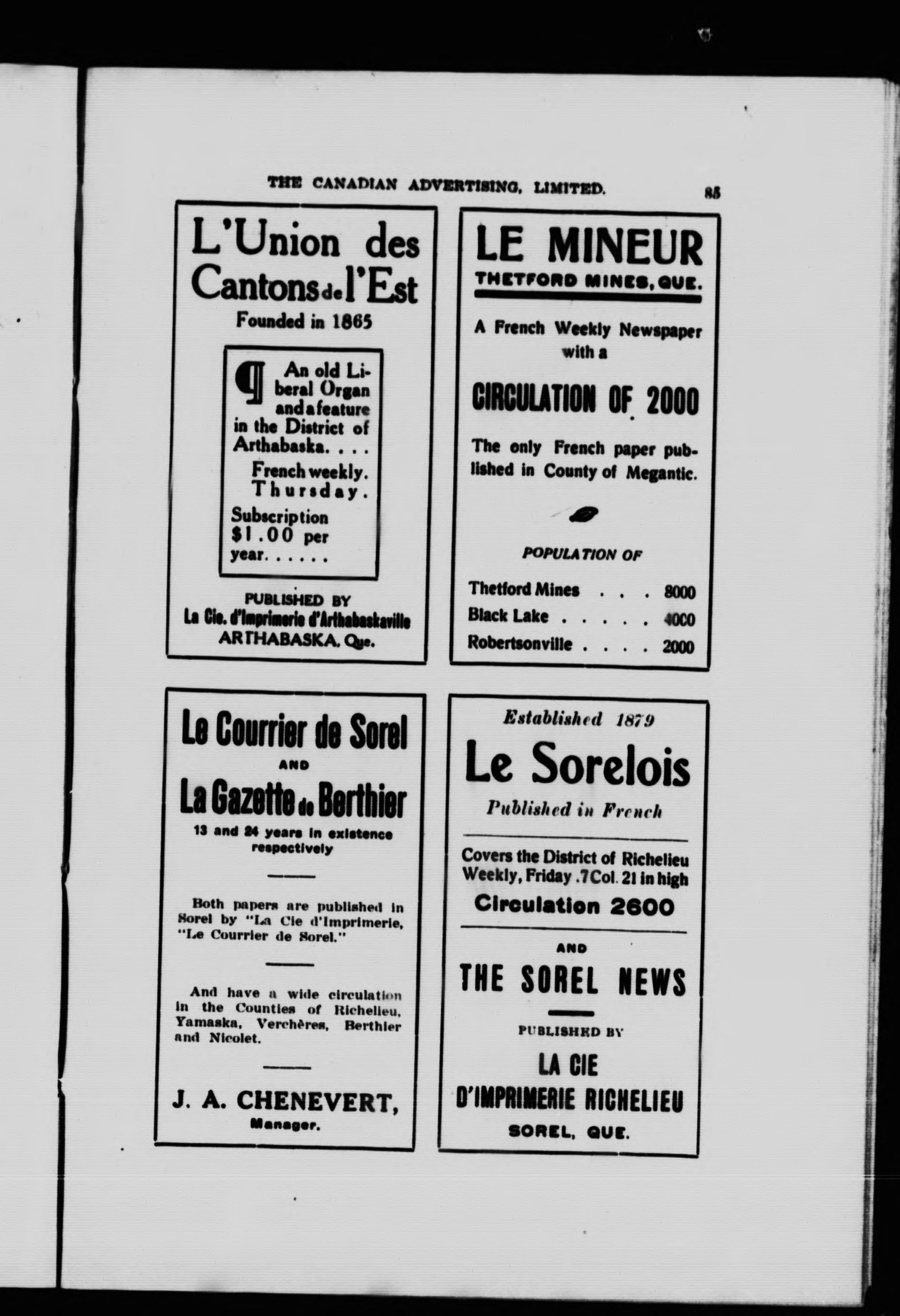 Aide Quebec : Canadian Advertising, [1913?]; 104 images, 100 avec recherche en texte intégral
