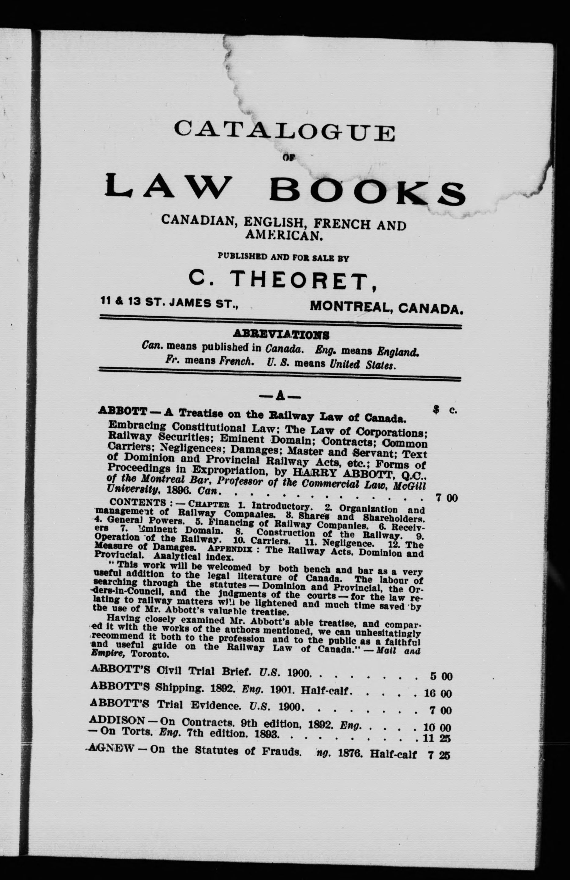 Catalogue of law books published in Canada, Great Britain, France and United States : classified alphabetially under the name of authors, followed with an alphabetical index of subjects - Adresse bibliographique