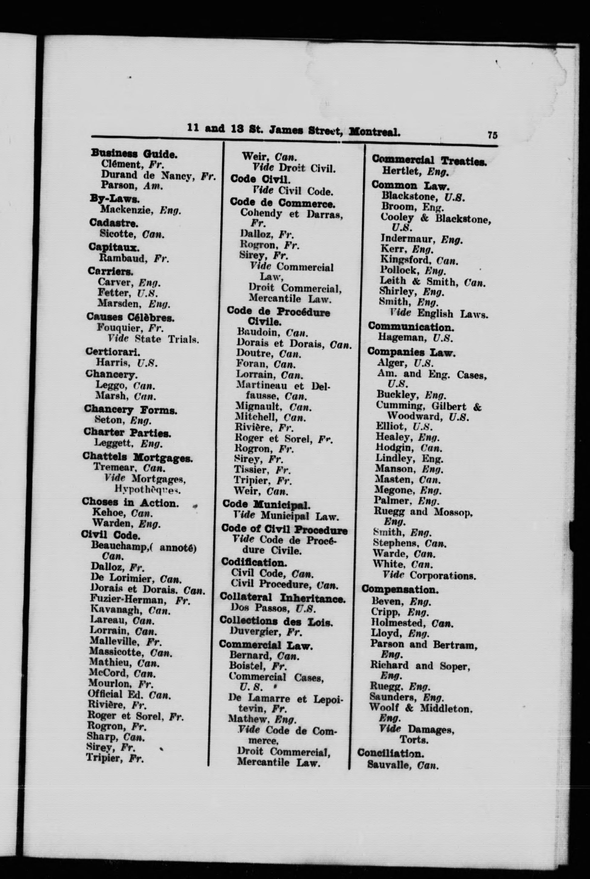 Catalogue of law books published in Canada, Great Britain, France and United States : classified alphabetially under the name of authors, followed with an alphabetical index of subjects - Adresse bibliographique