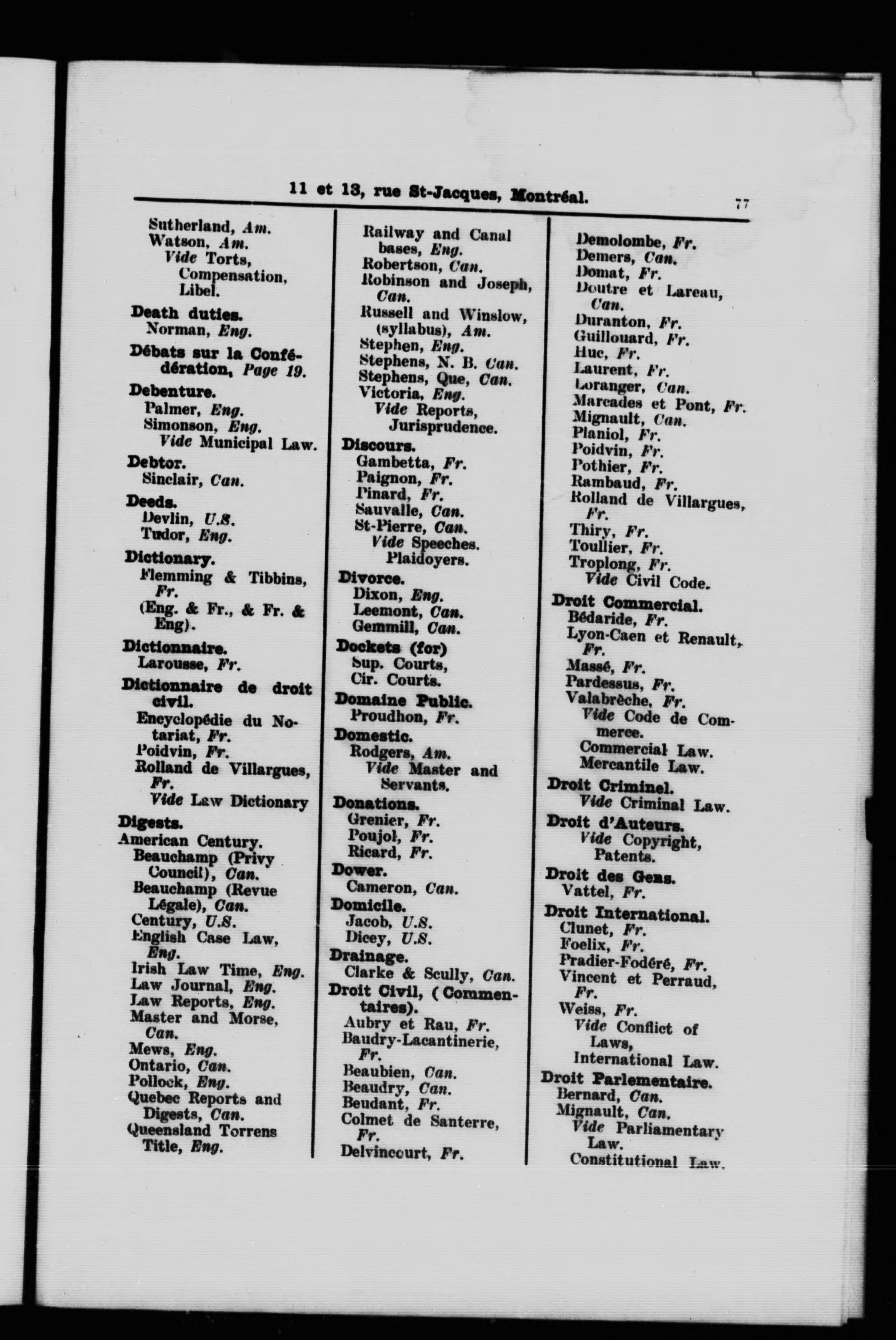 Catalogue of law books published in Canada, Great Britain, France and United States : classified alphabetially under the name of authors, followed with an alphabetical index of subjects - Adresse bibliographique