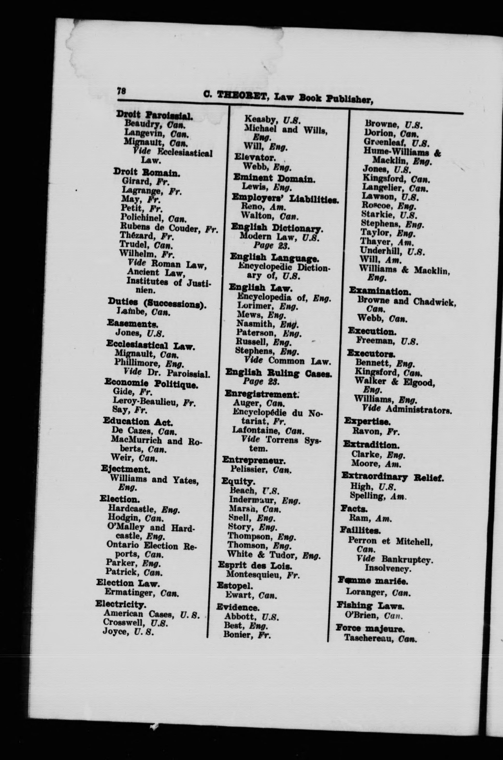 Catalogue of law books published in Canada, Great Britain, France and United States : classified alphabetially under the name of authors, followed with an alphabetical index of subjects - Adresse bibliographique