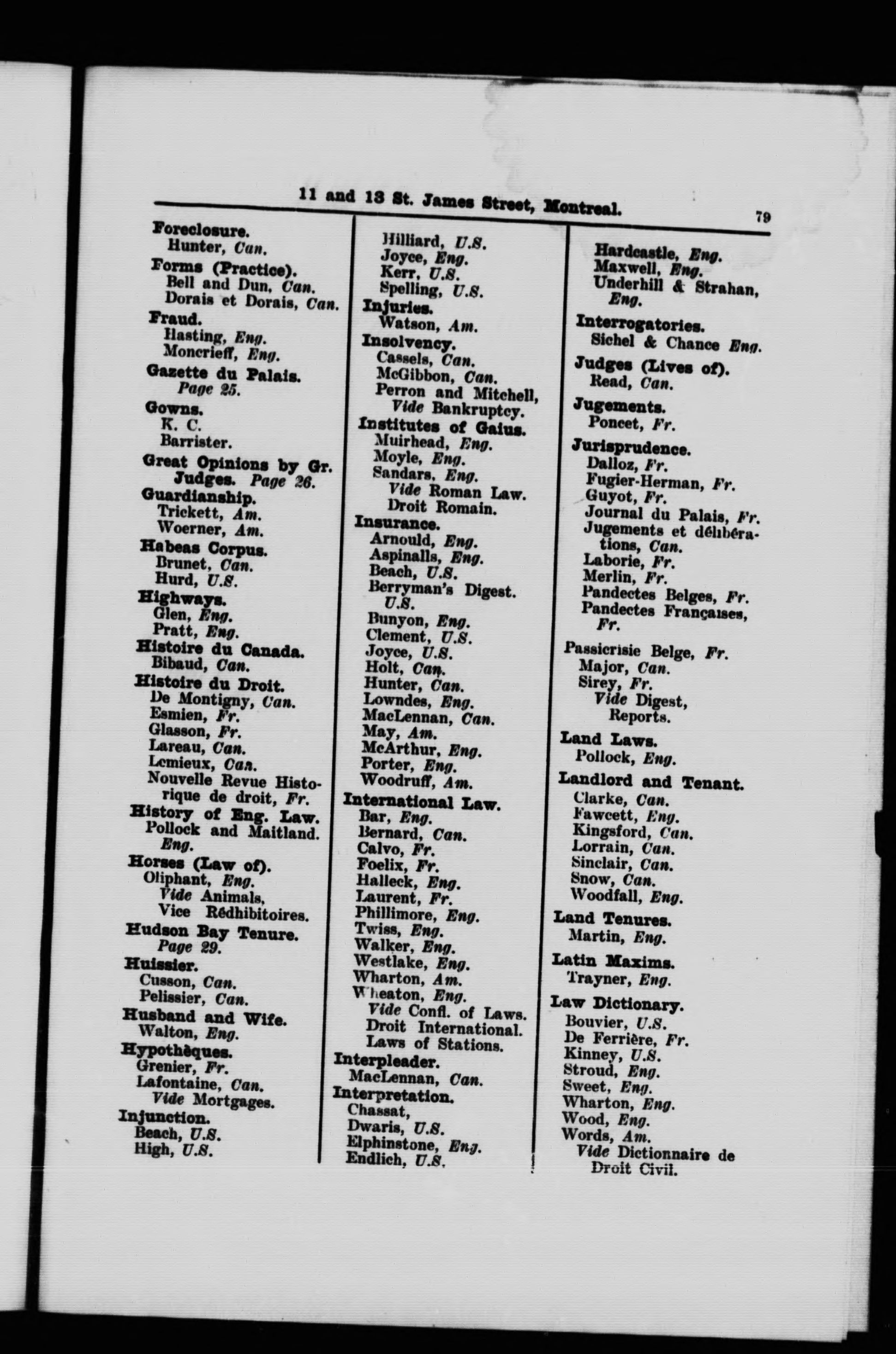 Catalogue of law books published in Canada, Great Britain, France and United States : classified alphabetially under the name of authors, followed with an alphabetical index of subjects - Adresse bibliographique