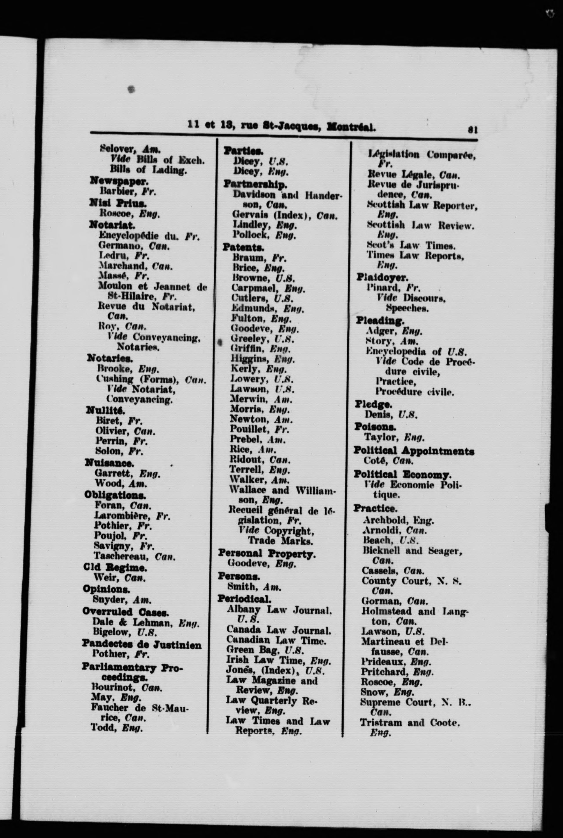 Catalogue of law books published in Canada, Great Britain, France and United States : classified alphabetially under the name of authors, followed with an alphabetical index of subjects - Adresse bibliographique