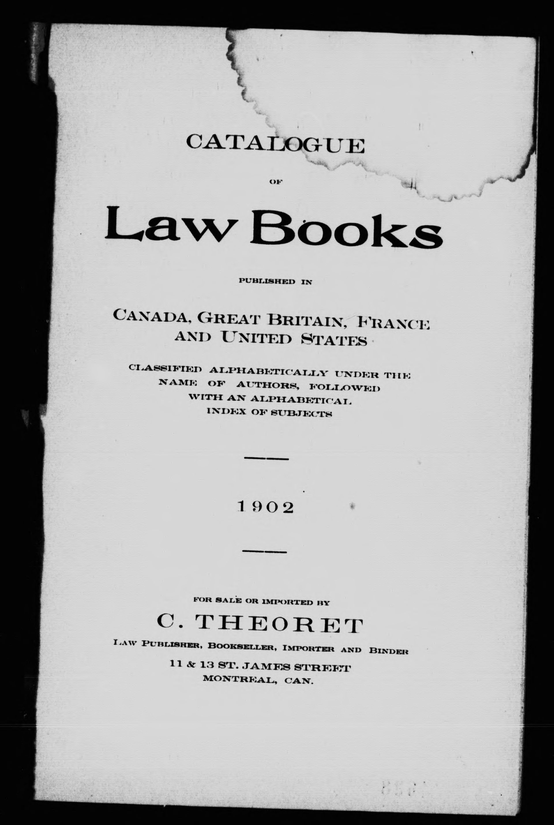 Catalogue of law books published in Canada, Great Britain, France and United States : classified alphabetially under the name of authors, followed with an alphabetical index of subjects - Adresse bibliographique