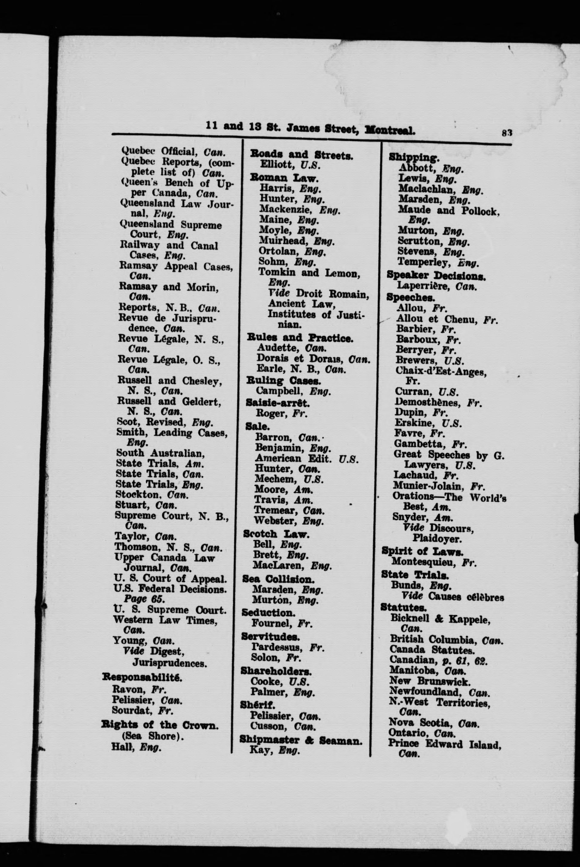 Catalogue of law books published in Canada, Great Britain, France and United States : classified alphabetially under the name of authors, followed with an alphabetical index of subjects - Adresse bibliographique