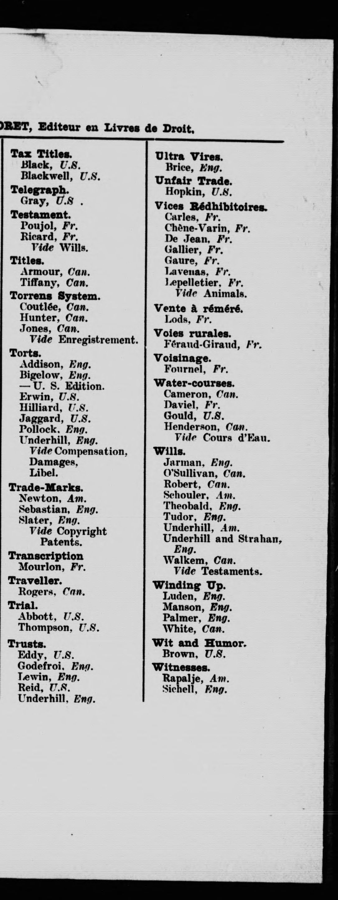 Catalogue of law books published in Canada, Great Britain, France and United States : classified alphabetially under the name of authors, followed with an alphabetical index of subjects - Adresse bibliographique