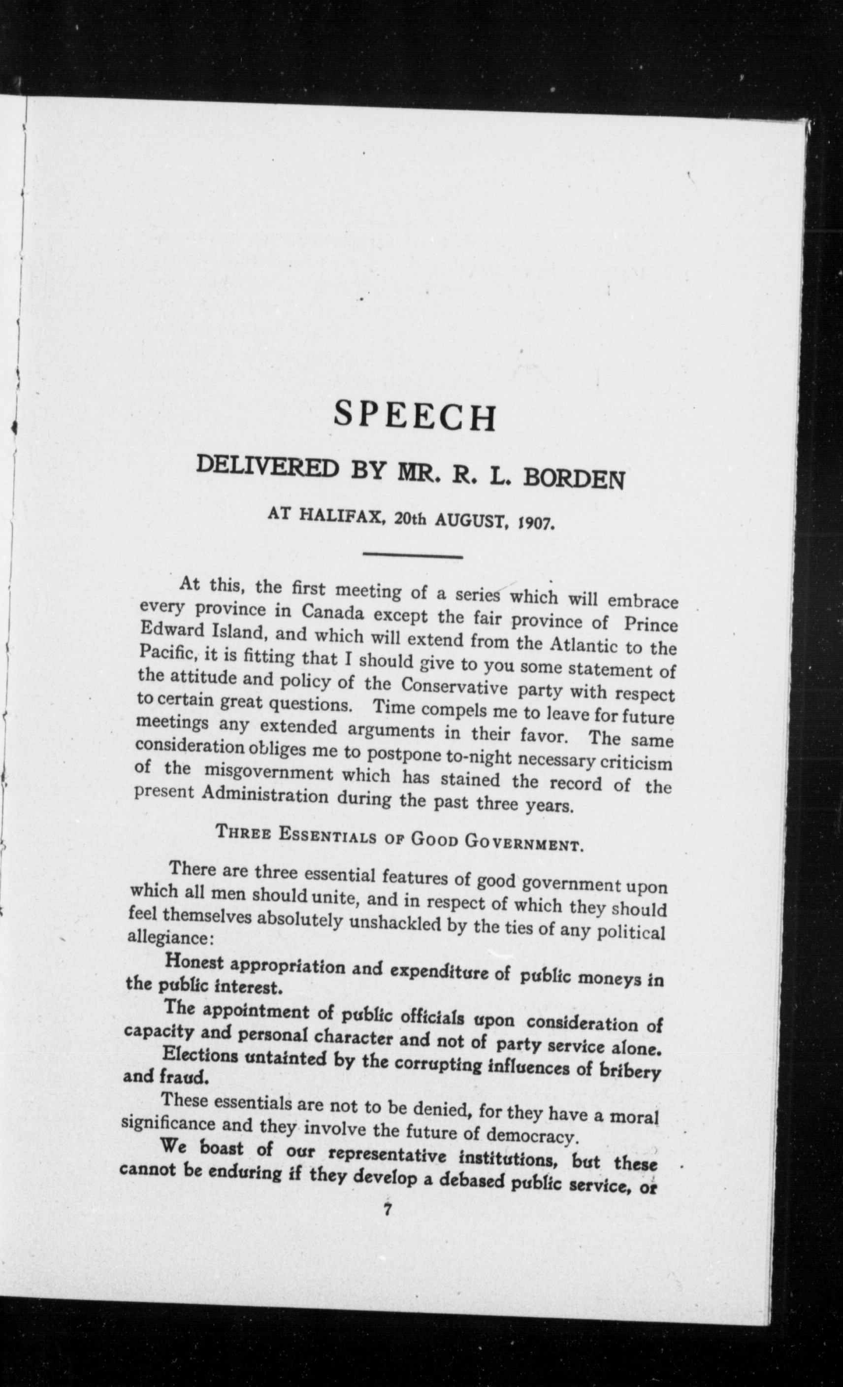 The Liberal-Conservative platform as laid down by R.L. Borden, M. P., opposition leader at Halifax, August 20th, 1907.